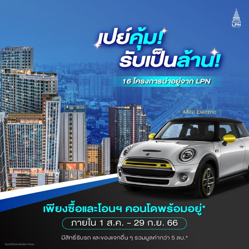 บริษัท แอล.พี.เอ็น.ดีเวลลอปเมนท์ จำกัด (มหาชน) กระตุ้นยอดขายช่วงโค้งสุดท้ายของไตรมาส 3 ปีนี้ ด้วยบิ๊กแคมเปญ ‘เปย์คุ้ม! รับเป็นล้าน!’* นำโครงการคอนโดมิเนียมพร้อมอยู่ 16 โครงการทั่วประเทศ มาเสนอขายในราคาในราคาพิเศษเริ่มต้น 1.09 ล้านบาท*พร้อมสิทธิ์รับของรางวัลทันที! สำหรับผู้ที่ซื้อและโอน* ภายในวันที่ 29 กันยายนนี้ รวมมูลค่าของรางวัลกว่า 5 ล้านบาท* อาทิ รถยนต์ไฟฟ้า Mini Cooper, รถจักรยานยนต์ Honda Scoopy I, ทองคำ, IPAD, และเครื่องใช้ไฟฟ้าอีกมากมาย (*เงื่อนไขเป็นไปตามที่บริษัทฯ กำหนด) สำหรับ 16 โครงการพร้อมอยู่ที่เข้าร่วมแคมเปญ ‘เปย์คุ้ม! รับเป็นล้าน!’* ประกอบด้วย