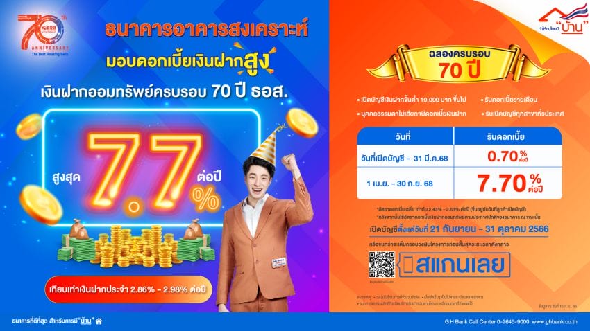 ธนาคารอาคารสงเคราะห์ (ธอส.) ตอบแทนลูกค้าเนื่องในโอกาสครบรอบ 70 ปี ด้วยการจัดทำผลิตภัณฑ์เงินฝากออมทรัพย์ครบรอบ 70 ปี ธอส. รับผลตอบแทนอัตราดอกเบี้ยแบบขั้นบันไดสูงสุดถึง7.70% ต่อปี เพียงเปิดบัญชีเงินฝากขั้นต่ำ 10,000 บาทขึ้นไป ตั้งแต่วันที่ 21 กันยายน – 31 ตุลาคม 2566 ที่สาขาธนาคารทั่วประเทศ โดยตั้งแต่วันที่เปิดบัญชีถึงวันที่ 31 มีนาคม 2568 จะได้รับอัตราดอกเบี้ย 0.70% ต่อปี และตั้งแต่วันที่ 1 เมษายน – 30 กันยายน 2568 จะได้รับอัตราดอกเบี้ย 7.70% ต่อปี ทั้งนี้ ลูกค้าจะได้รับอัตราดอกเบี้ยเฉลี่ยรวมสูงถึง 2.43 – 2.53% ต่อปี (เงื่อนไขเป็นไปตามที่ธนาคารกำหนด) พิเศษ!! รับดอกเบี้ยรายเดือนและไม่เสียภาษีดอกเบี้ยเงินฝาก