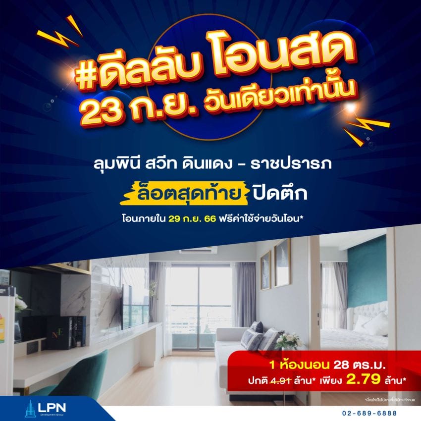 บริษัท แอล.พี.เอ็น.ดีเวลลอปเมนท์ จำกัด (มหาชน) จัดโปรโมชัน #ดีลลับโอนสด ลดเป็นล้าน* นำ 7 โครงการคอนโดมิเนียมพร้อมอยู่ราคาเริ่มต้นต่ำกว่าล้าน – 2.95 ล้าน* รับส่วนลดสูงสุด 1.8 ล้านบาท* และของแถมอีกมากมาย อาทิ ค่าใช้จ่ายวันโอน* เครื่องปรับอากาศ* สิทธิพิเศษนี้เฉพาะวันที่ 23 กันยายน 2566 เท่านั้น! (*เงื่อนไขเป็นไปตามที่บริษัทฯ กำหนด)