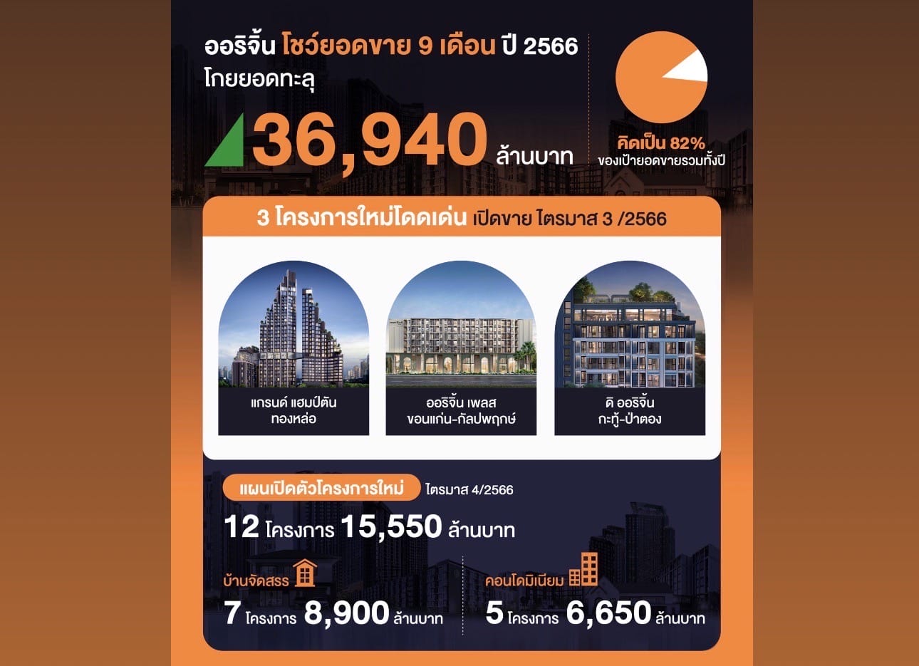 ออริจิ้น พร็อพเพอร์ตี้ กวาดยอดขายบ้าน–คอนโด Q3/2566 เพิ่มอีก 12,475 ล้าน หนุนยอดขาย9 เดือนแรกปี 66 ทะลุ 36,940 ล้าน คิดเป็น 82% ของเป้ายอดขายรวมทั้งปี ตลาดฝั่งธนฯ–ต่างจังหวัด ยังคึก 3 แบรนด์หลัก โซ ออริจิ้น, ออริจิ้น เพลส, ดิ ออริจิ้น ดีไซน์–ฟังก์ชัน–แนวคิด Pet Lover Condo โดนใจคนพื้นที่ โกยยอดต่อเนื่อง ไตรมาสสุดท้ายเตรียมเปิดโครงการใหม่ช่วงไฮซีซั่นอีกกว่า 12 โครงการ มูลค่าโครงการรวม 15,550 ล้าน มั่นใจยอดขายทั้งปีทะลุเป้า45,000 ล้านบาท