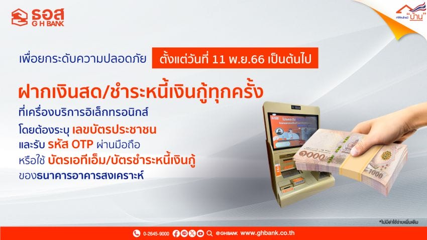 ทั้งนี้ การแสดงตัวตนก่อนการทำธุรกรรมเงินสดผ่านเครื่องบริการอิเล็กทรอนิกส์ (CDM/ATM , ADM , LRM) สามารถดำเนินการได้ง่าย ๆ 2 แนวทาง ประกอบด้วย 1.ผู้ฝากเงินใส่หมายเลขประจำตัวประชาชน 13 หลัก ของผู้ฝากเงิน และหมายเลขโทรศัพท์มือถือ เพื่อรับรหัส OTP (One-Time Password) ก่อนนำฝากผ่านเครื่องบริการอิเล็กทรอนิกส์ (CDM/ATM, ADM,LRM) ของธนาคาร โดยมีวงเงินฝากสูงสุด 30,000 บาท ต่อครั้ง (รวมค่าธรรมเนียม) และ 2.ผู้ฝากเงินใช้บัตร ATM ของ ธอส. พร้อมใส่รหัสส่วนตัว (PIN Code) ก่อนนำฝาก ผ่านเครื่อง CDM/ATM , ADM หรือบัตรชำระหนี้เงินกู้ (GHB Pay Card)ที่เครื่อง LRM ของธนาคาร โดยมีวงเงินฝาก/ชำระหนี้สูงสุด 100,000 บาท ต่อครั้ง (รวมค่าธรรมเนียม)