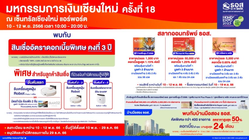 สำหรับลูกค้าที่จองสิทธิ์และซื้อสลากออมทรัพย์ จำนวนเงินตั้งแต่ 5 แสนบาท แต่ไม่เกิน 2 ล้านบาทต่อรายการ จะได้รับบัตร Starbucks มูลค่า 150 บาท ท่านละ 1 ใบ ต่อผลิตภัณฑ์ และซื้อจำนวนเงินมากกว่า 2 ล้านบาทขึ้นไปต่อรายการ จะได้รับเซ็ตกล่องสำหรับใส่อาหาร Super Lock มูลค่า 699 บาท ท่านละ 1 ชุด ต่อผลิตภัณฑ์ หรือจนกว่าของสมนาคุณจะหมดบ้านมือสอง ธอส. คุณภาพดี ทำเลเด่นหลากหลายประเภทใน จ.เชียงใหม่ และพื้นที่ใกล้เคียงมากกว่า 400 รายการ มาจำหน่ายด้วยส่วนลดพิเศษสูงสุด 50% ของราคาประเมิน โดยมีรายการที่น่าสนใจ อาทิ บ้านเดี่ยว 1 ชั้น ขนาดเนื้อที่ 62 ตารางวา ในโครงการหมู่บ้านแพรวารี อ.เมืองพะเยา จ.พะเยา ราคาจำหน่ายพิเศษเหลือเพียง 1.28 ล้านบาท จากราคาปกติ 1.45 ล้านบาท ผู้ที่สนใจซื้อทรัพย์สามารถวางเงินประกันการซื้อทรัพย์ รายการละ 5,000 บาท นอกจากนี้ยังมีโปรโมชัน สินเชื่ออัตราดอกเบี้ยต่ำสุด นานสูงสุดถึง 24 เดือน โดยลูกค้าสามารถเลือกชมบ้านมือสองของธนาคารได้ที่ www.ghbhomecenter.com, Mobile Application : GHB ALL HOME ทั้งนี้ ลูกค้าที่ใช้บริการผลิตภัณฑ์ทางการเงิน ตามเงื่อนไขและระยะเวลาที่ธนาคารกำหนด จะได้รับของสมนาคุณฟรีอีกมากมาย โดยงานมหกรรมการเงิน เชียงใหม่ ครั้งที่ 18 มีกำหนดจัดขึ้นระหว่างวันที่ 10 – 12 พฤศจิกายน 2566 ณ เซ็นทรัล เชียงใหม่ แอร์พอร์ต