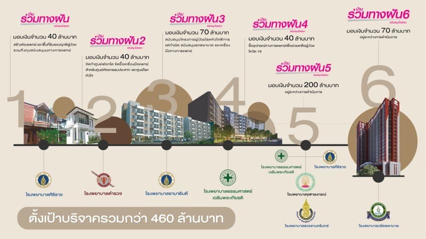 ล่าสุดโครงการ บ้านร่วมทางฝัน 6 “ปิ่นเกล้า – บรมราชชนนี” โครงการใหม่ที่กำลังอยู่ระหว่างดำเนินการ ที่เสนา ยังคงมีความตั้งใจทำเพื่อยกระดับคุณภาพชีวิตที่ดีให้กับผู้อยู่อาศัย ทั้งด้านการออกแบบโครงการ และเป็นสะพานบุญให้ผู้ซื้อด้วยการเปลี่ยนผลกำไรที่ได้จากการขายห้องชุดในโครงการนี้ โดยตั้งเป้าไว้ที่ 70 ล้านบาท เพื่อนำไปสนับสนุนทางการแพทย์ให้กับ ร.พ.วชิรพยาบาล* ในการส่งต่อโอกาสของชีวิตอย่างไม่สิ้นสุดต่อไป