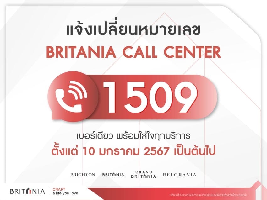 บริษัท บริทาเนีย จำกัด (มหาชน) หรือ BRI ผู้นำในการพัฒนาอสังหาริมทรัพย์ ที่มุ่งมั่นพัฒนาที่อยู่อาศัยเพื่อสังคมที่ดีอย่างยั่งยืน แจ้งเปลี่ยนเบอร์ Britania Call Center จากหมายเลข 02-161-3000 เป็นหมายเลข “1509” เบอร์เดียว พร้อมใส่ใจทุกบริการ เริ่มเปิดใช้อย่างเป็นทางการ โดยทีมงาน Call Center ที่พร้อมให้บริการทุกวันทำการ ตั้งแต่เวลา 08.00-20.00 น.10 มกราคม 2567 เป็นต้นไป