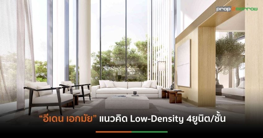 อีเดน เอสเตท คอร์ปอเรชั่น เปิดตัวคอนโดฯโลว์ไรส์ “อีเดน เอกมัย” ตั้งอยู่บนถนนเอกมัยซอย 12 เจาะตลาดระดับ Ultra-Luxury Low-Density ด้วยห้องชุดแบบไพรเวท 17 ยูนิต พื้นที่ใช้สอยเริ่มต้น 220 ตร.ม.พร้อมที่จอดรถมาตรฐานกว่า300% ราคาสตาร์ท 70 ล้านบาทสูงสุด 170 ล้านบาท มีกำหนดก่อสร้างแล้วเสร็จในปี 2569