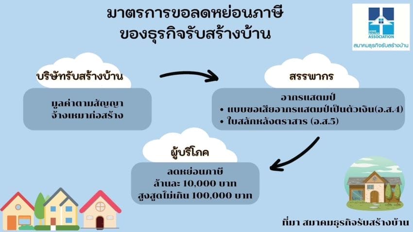 โดยสมาคมรับสร้างบ้านได้นำเสนอให้ สร้างบ้านลดหย่อนภาษีได้ ด้วยการลดหย่อนภาษีเงินได้บุคคลธรรมดาสำหรับผู้ที่ต้องการปลูกสร้างบ้านบนที่ดินของตนเอง โดยในรายละเอียดจะยึดเอามูลค่าการก่อสร้างบ้านตามสัญญาจ้างเหมาก่อสร้างที่ติดอากรแสตมป์ (อ.ส.5) กับกรมสรรพากร เพื่อนำไปเป็นหลักฐานการลดหย่อนภาษีบุคคลธรรมดาในรอบภาษีปีถัดไป ในอัตราลดหย่อนล้านละ10,000 บาท และสูงสุดไม่เกิน 100,000 บาท ทั้งนี้หากได้รับการพิจารณาและประกาศใช้อย่างเป็นทางการ นับว่าเป็นครั้งแรกของธุรกิจรับสร้างบ้านที่นำมาตรการด้านลดหย่อนภาษีให้กับคนที่ปลูกสร้างบ้านบนที่ดินตัวเอง