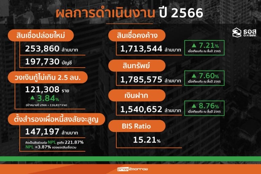 นายกมลภพ วีระพละ กรรมการผู้จัดการ ธนาคารอาคารสงเคราะห์ (ธอส.) เปิดเผยถึงผลการดำเนินงานปี 2566 ว่า ณ วันที่ 31 ธันวาคม 2566 ธอส.สามารถปล่อยสินเชื่อใหม่ได้ 253,860 ล้านบาท จำนวน 197,730 บัญชี สูงกว่าเป้าหมายที่ตั้งไว้ที่ 235,480 ล้านบาท ในจำนวนนี้เป็นสินเชื่อปล่อยใหม่สำหรับกลุ่มผู้มีรายได้น้อยและปานกลางวงเงินกู้ไม่เกิน 2.5 ล้านบาท จำนวน 121,308 ราย สูงขึ้นกว่าเป้าหมาย 3.84%ที่ตั้งไว้ที่ 116,817 ราย ทำให้ ณ สิ้นไตรมาสที่ 4/2566 เทียบกับ ณ สิ้นปี 2565 ธนาคารมีสินเชื่อคงค้างรวมทั้งสิ้น 1,713,544 ล้านบาท เพิ่มขึ้น 7.21% มีสินทรัพย์รวม 1,785,575 ล้านบาท เพิ่มขึ้น 7.60% เงินฝากรวม 1,540,652 ล้านบาท เพิ่มขึ้น 8.76% และมีหนี้ที่ไม่ก่อให้เกิดรายได้ (NPL) จำนวน 66,343 ล้านบาท คิดเป็น 3.87% ของยอดสินเชื่อรวม