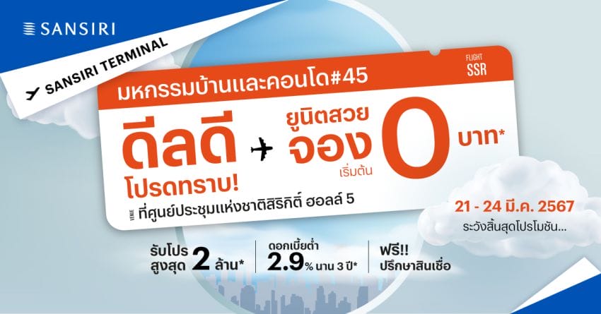 ศูนย์ประชุมแห่งชาติสิริกิติ์ฯ ระหว่างวันที่ 21-24 มีนาคม นี้เท่านั้น กับ “แสนสิริ เทอร์มินัล ดีลดี โปรดทราบ” พบกับบ้าน ทาวน์โฮม คอนโดมิเนียมจากแสนสิริ ที่โหลดโปรดีๆ ขึ้นเครื่องมาแบบจัดเต็ม พร้อม Big Surprise