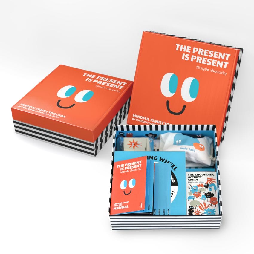 ทั้งนี้ภายในกล่อง ‘The Present is Present’ Mindful Family Toolbox จะเป็นกิจกรรมฝึกการรู้เนื้อรู้ตัวร่วมกันในครอบครัว ผ่าน 4 กลุ่มเครื่องมือ ได้แก่ The Feeling, The Focusing, The Breathing และ The Grounding ซึ่งทั้ง 4 กลุ่มนี้ คือหัวใจสำคัญของ Mindfulness หรือ ‘การมีสติรู้เนื้อรู้ตัว’ ซึ่งเป็นเครื่องมือแห่งใจที่จะช่วยให้เด็กๆ ได้รับรู้ถึง ‘ปัจจุบันขณะ’ ผ่าน ‘การเล่น’ โดยมีผู้ใหญ่ทำหน้าที่สนับสนุนและประคับประคอง พร้อมร่วมสร้างประสบการณ์การเรียนรู้ภายใน ซึ่งนอกจากจะเป็นของขวัญที่เสริมสร้างครอบครัวให้แข็งแรงขึ้นแล้ว ยังสามารถมอบเป็นของขวัญให้แก่ได้ในทุกวาระโอกาสตลอดทั้งปีได้ด้วย