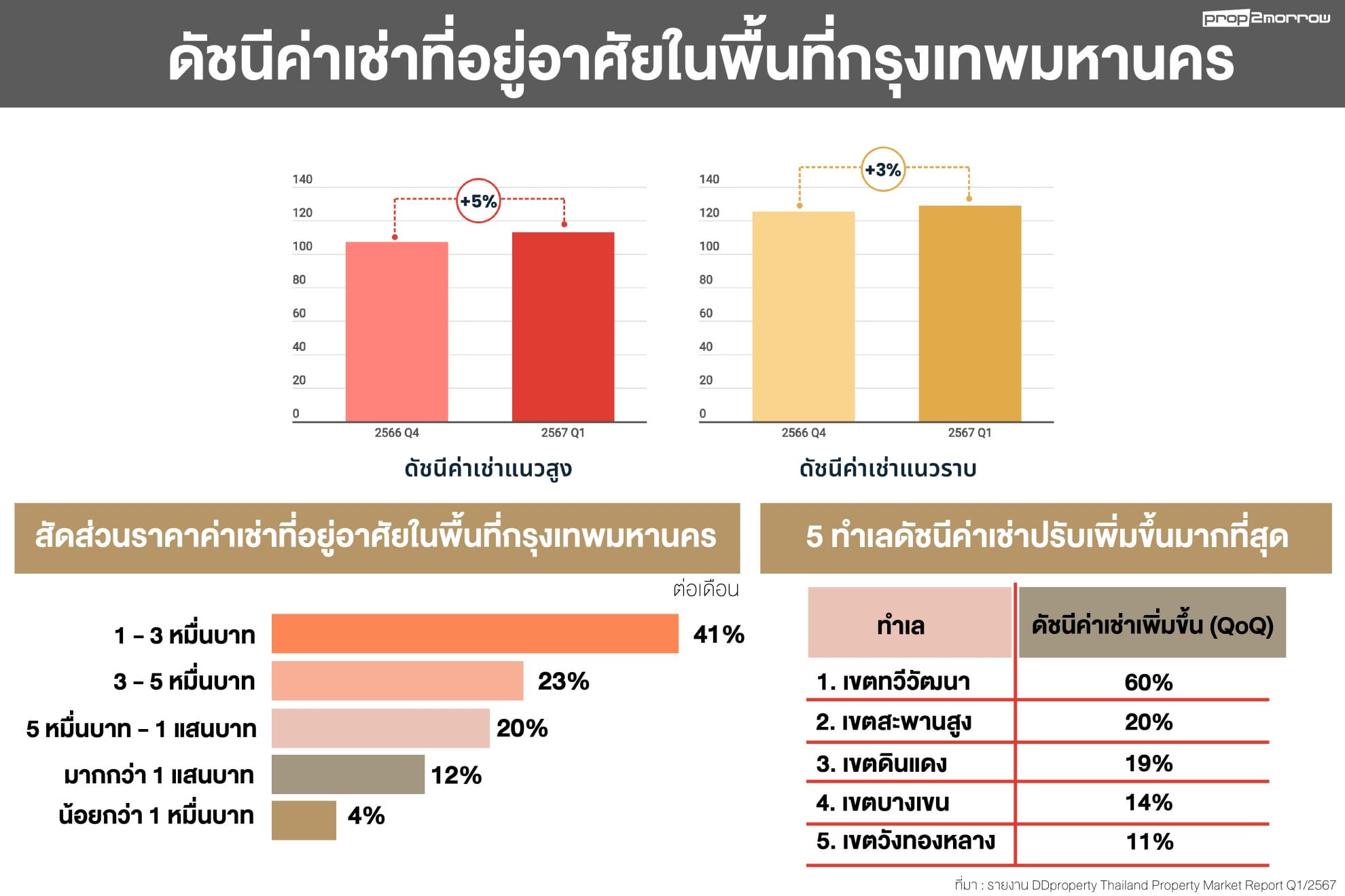 ภาพรวมตลาดเช่าที่อยู่อาศัยทั่วประเทศยังคงมีทิศทางเติบโตในแง่ของราคาอย่างต่อเนื่อง โดยพบว่าดัชนีค่าเช่าที่อยู่อาศัยแนวสูงอย่างคอนโดฯ และอะพาร์ตเมนต์ปรับเพิ่มขึ้น 5% QoQ และเพิ่มขึ้น 22% YoY เช่นเดียวกับดัชนีค่าเช่าที่อยู่อาศัยแนวราบอย่างบ้านเดี่ยวและทาวน์เฮ้าส์ เพิ่มขึ้น 4% QoQ และเพิ่มขึ้น 28% YoY แต่สวนทางกับความต้องการเช่าทั่วประเทศที่ปรับลดลง 10% QoQ (ลดลง 25% YoY)