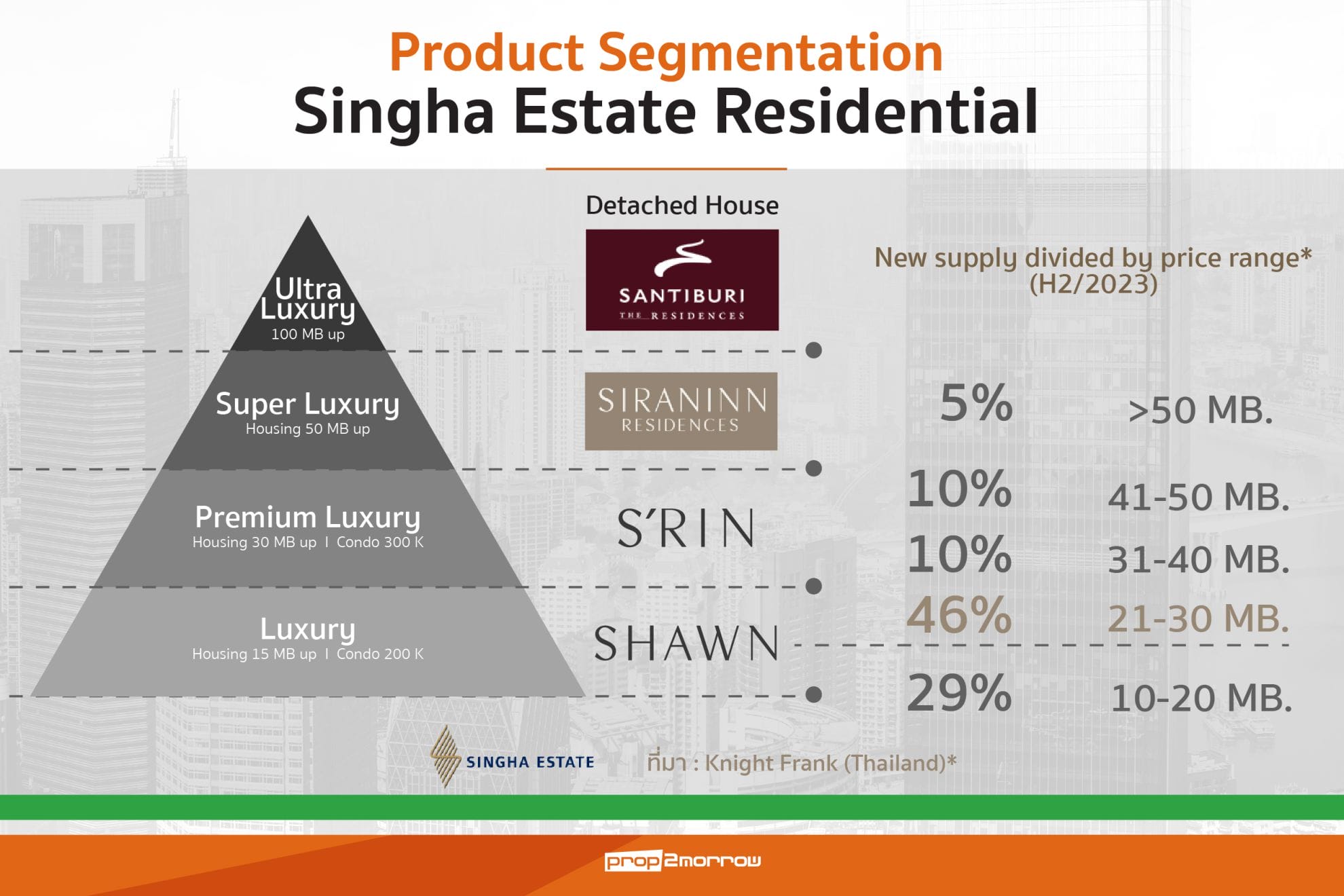 นายณัฐวุฒิ มัธยมจันทร์ ประธานเจ้าหน้าที่บริหาร การพัฒนาธุรกิจพักอาศัย บริษัทสิงห์ เอสเตท จำกัด (มหาชน) เปิดเผยว่า ปัจจุบันบริษัทได้เปิดตัวบ้านเดี่ยวในกลุ่ม Luxury จำนวน 4แบรนด์ คือ แบรนด์สันติบุรี ระดับราคา 200 กว่าล้านบาทขึ้นไป แบรนด์ศิรนินทร์ เรสซิเดนเซส ระดับราคา 50 ล้านบาทขึ้นไป แบรนด์สริน ระดับราคา 30-50 ล้านบาท และล่าสุดได้เปิดตัวแบรนด์ใหม่ชื่อว่า ฌอน อยู่ในพอร์ตที่อยู่อาศัยระดับลักชัวรีราคา 15-30 ล้านบาท ซึ่งเดิมวางแผนจะเปิดตัวในช่วงปลายปี 2566 ที่ผ่านมา แต่ได้มีการปรับรูปแบบและดีไซน์ใหม่เพื่อตอบโจทย์กับความต้องการของกลุ่มลูกค้าที่เป็นคนรุ่นใหม่ โดยจะเปิดพรีเซลพร้อมกัน 2โครงการในวันที่ 25-26 พฤษภาคมนี้ ราคาเริ่มต้น19 ล้านบาท