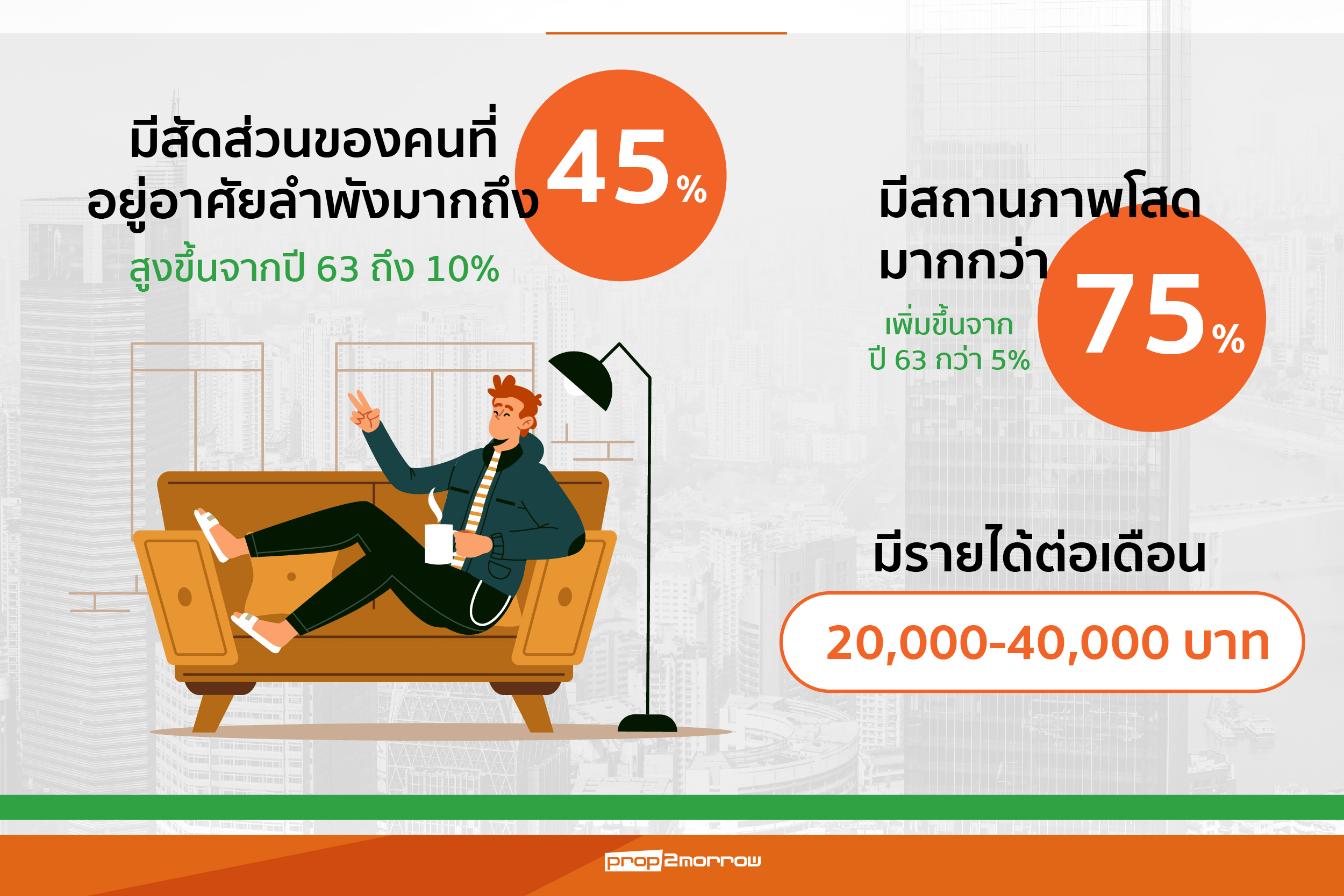 ในขณะที่ผลสำรวจของแอล.ดับเบิลยู.เอส.ฯ เมื่อเดือนพฤษภาคม ปี 2566 จากจำนวนผู้อยู่อาศัยในโครงการคอนโดมิเนียมในพื้นที่กรุงเทพฯ-ปริมณฑลจำนวน 729 ตัวอย่าง พบว่า มีสัดส่วนของคนที่อยู่เพียงลำพัง คิดเป็นสัดส่วน 45% สูงขึ้นจากปี 2563 ถึง 10% และมีสถานภาพโสดมากกว่า 75% เพิ่มขึ้นจากปี 2563 ประมาณ 5% โดยมีรายได้ต่อเดือนอยู่ในช่วง 20,000-40,000 บาท