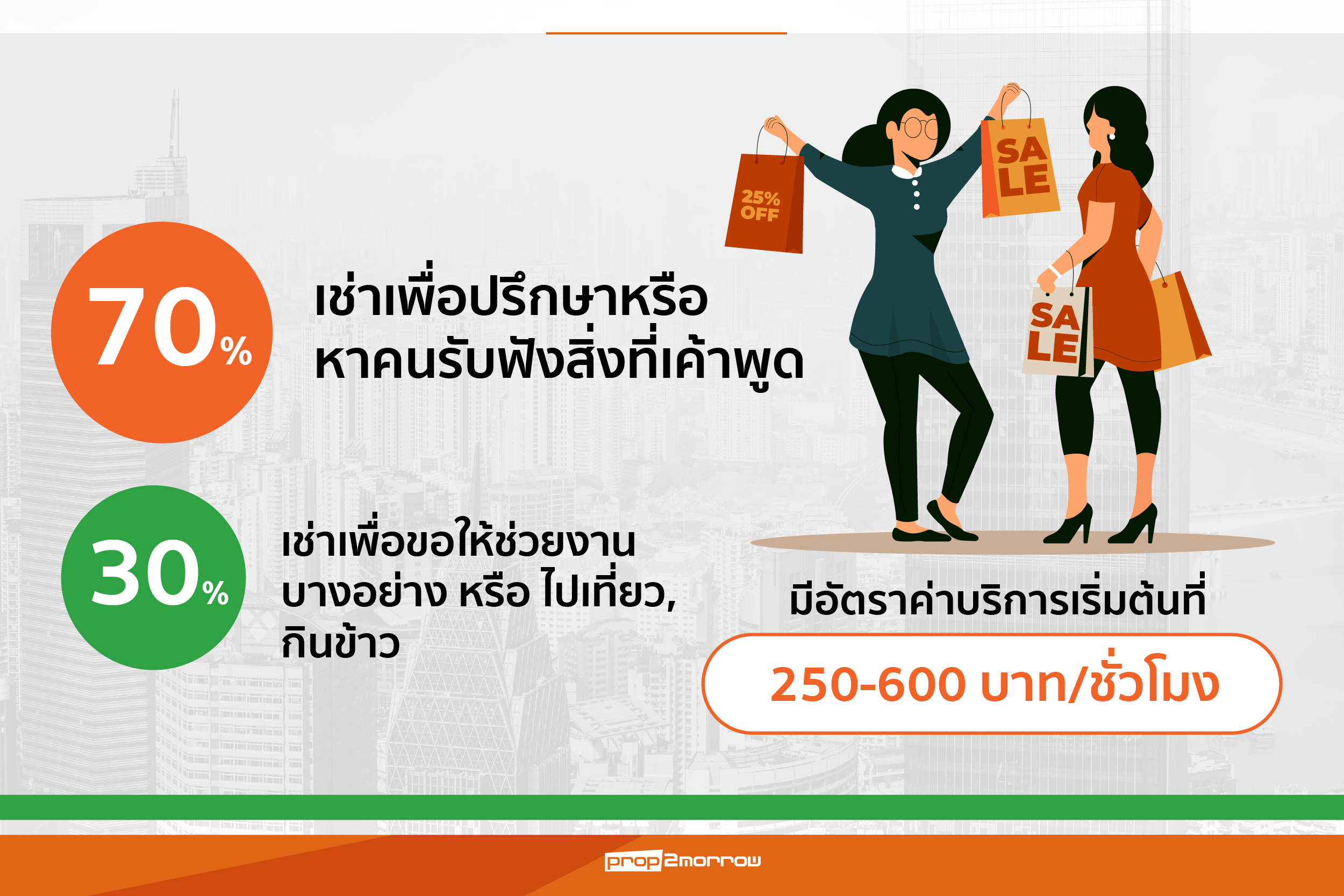 บริการเพื่อนรับจ้าง ปัจจุบันธุรกิจเช่าเพื่อนเริ่มเป็นที่นิยมอย่างมากของกลุ่มคนรุ่นใหม่ทั้งในรูปแบบออนไลน์และออนไซต์ โดยเฉพาะในประเทศจีนและญี่ปุ่น จากข้อมูลสำนักงานข่าวนิกเคอิ เอเชีย และกรุงศรี กูรู รายงานว่า ธุรกิจที่สร้างรายได้จากการให้เช่าเวลาของตัวเอง เพื่อตอบสนองความต้องการของลูกค้า จากสถิติที่เก็บโดยเจ้าของธุรกิจ พบว่า กลุ่มลูกค้าที่ใช้บริการเช่าส่วนใหญ่เป็นผู้หญิง 70% เช่าเพื่อปรึกษาหรือหาคนรับฟังสิ่งที่เค้าพูด และอีก 30% เช่าเพื่อขอให้ช่วยงานบางอย่างหรือไปเที่ยว, กินข้าว ไปจนถึงพาไปโรงพยาบาลหรือฝากดูแลผู้สูงอายุ โดยมีอัตราค่าบริการเริ่มต้นที่ 250-600 บาทต่อชั่วโมง