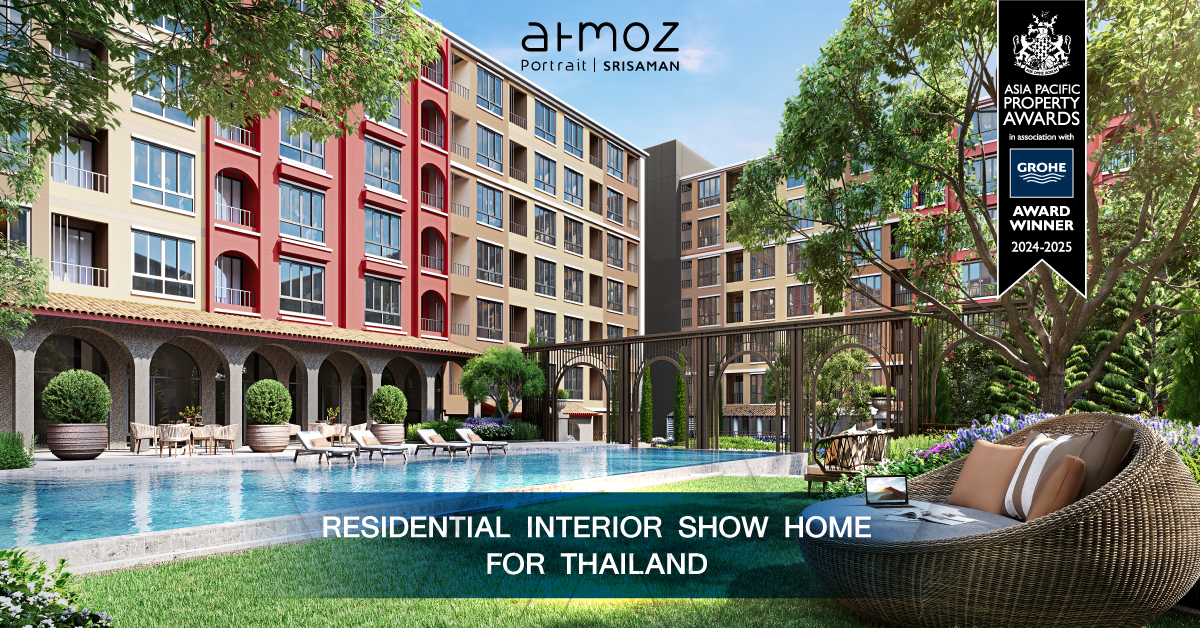 2. รางวัล Award Winner : Residential Interior Show Home Thailand จากโครงการแอทโมซ พอร์ทเทรต ศรีสมาน คอนโดมิเนียมพร้อมอยู่สไตล์รีสอร์ท โดดเด่นด้วยการดีไซน์แบบโมเดิร์นอิตาเลียน ซึ่งได้รับแรงบันดาลจาก “LAKE COMO” ประเทศอิตาลี ด้วยสถาปัตยกรรมที่มีเอกลักษณ์เฉพาะตัวไม่เหมือนใคร ไม่ว่าจะเป็นประตู, หน้าต่าง และผนังที่เป็นทรงโค้งสวยงาม (Arch) มาพร้อมสีสันสดใสตัดกับสายน้ำและท้องฟ้าสีครามท่ามกลางธรรมชาติบนพื้นที่โครงการกว่า 5 ไร่ ใกล้สนามบินดอนเมือง ตรงข้ามโรบินสันศรีสมาน