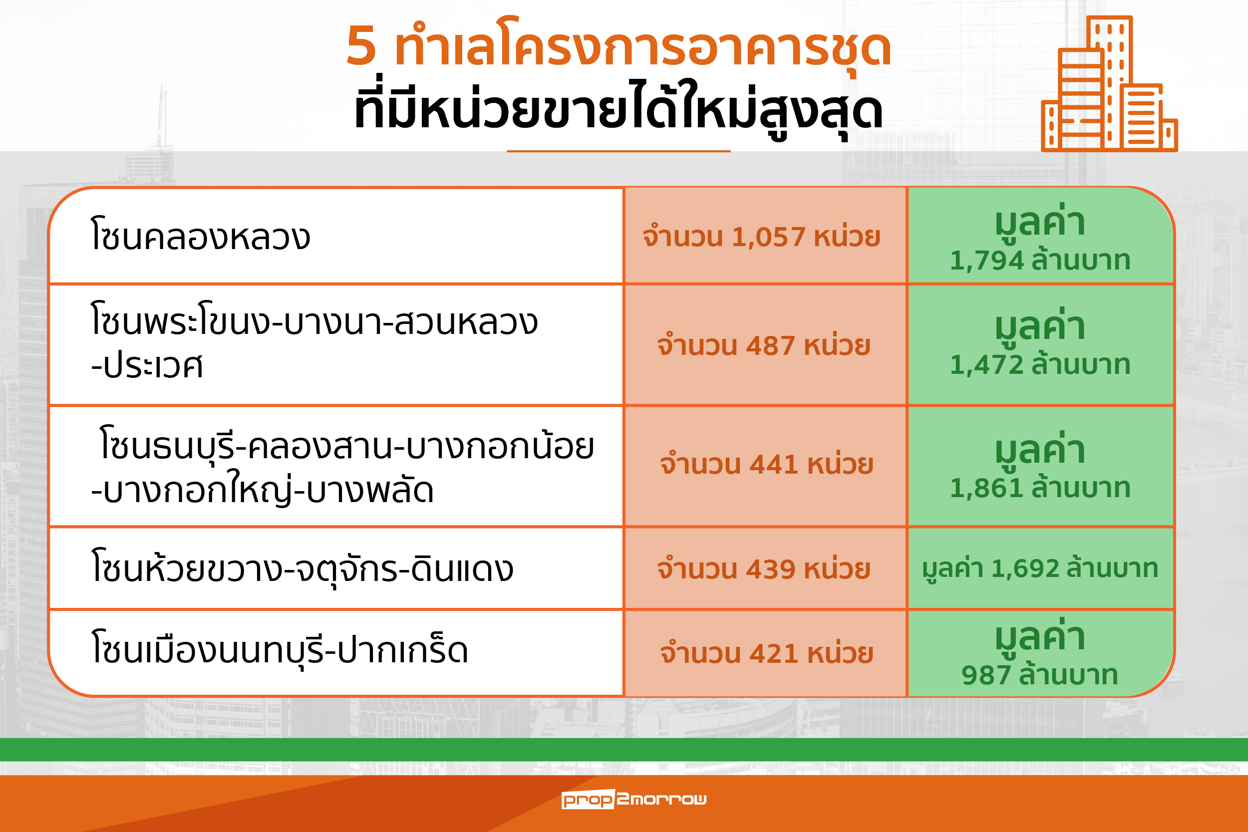 ส่วนตลาดอาคารชุด ในพื้นที่กรุงเทพฯ-ปริมณฑลในไตรมาส 1 พบว่า มีห้องชุดเสนอขาย 91,565 ยูนิต เพิ่มขึ้น 14.9% มูลค่า 397,717 ล้านบาท เมื่อเทียบกับช่วงเดียวกันของปีก่อน ขณะที่ยอดขายได้ใหม่มีจำนวน 5,940 ยูนิตลดลง -39% มูลค่า 27,207 ล้านบาท โดย 5 ทำเลที่มีหน่วยห้องชุดขายได้ใหม่สูงสุด ประกอบด้วย โซนคลองหลวง จำนวน 1,057 ยูนิต มูลค่า 1,794 ล้านบาท โซนพระโขนง-บางนา-สวนหลวง-ประเวศ จำนวน 487 ยูนิต มูลค่า 1,472 ล้านบาท โซนธนบุรี-คลองสาน-บางกอกน้อย-บางกอกใหญ่-บางพลัด จำนวน 441 ยูนิต มูลค่า 1,861 ล้านบาท โซนห้วยขวาง-จตุจักร-ดินแดง จำนวน 439 ยูนิต มูลค่า 1,692 ล้านบาท และโซนเมืองนนทบุรี-ปากเกร็ดจำนวน 421 ยูนิต มูลค่า 987 ล้านบาท