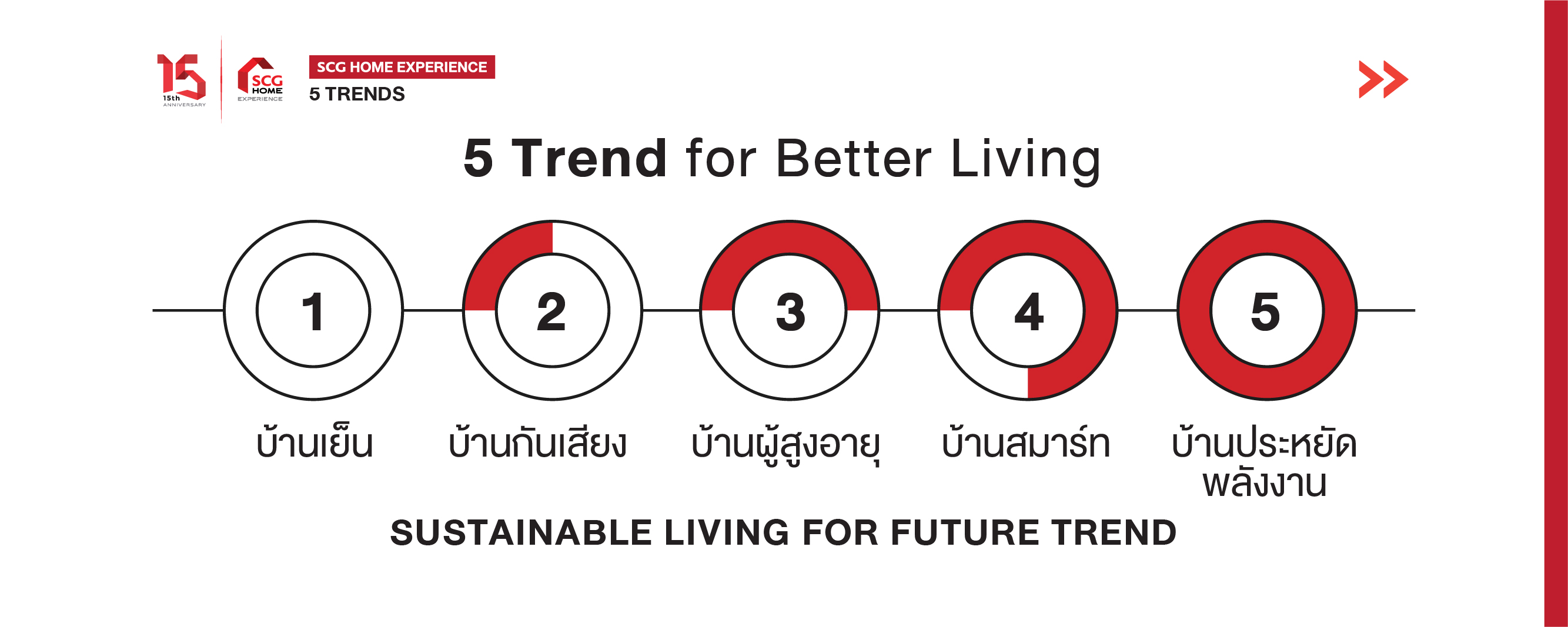 ขณะที่ 5 เทรนด์บ้านในรูปแบบ Sustainable Living ได้แก่ บ้านเย็น บ้านสมาร์ท บ้านผู้สูงอายุ บ้านกันเสียง และบ้านประหยัดพลังงาน โดยการนำสินค้าในกลุ่ม SCG Green Choice มาใช้ เน้นการลดโลกร้อน ลดการใช้พลังงาน ลดการปล่อยก๊าซเรือนกระจก ลดทรัพยากร และยืดอายุการใช้งานให้นานขึ้น ช่วยสร้างสุขภาวะที่ดีในการอยู่อาศัยและมีสภาพแวดล้อมเหมาะแก่การอยู่อาศัย