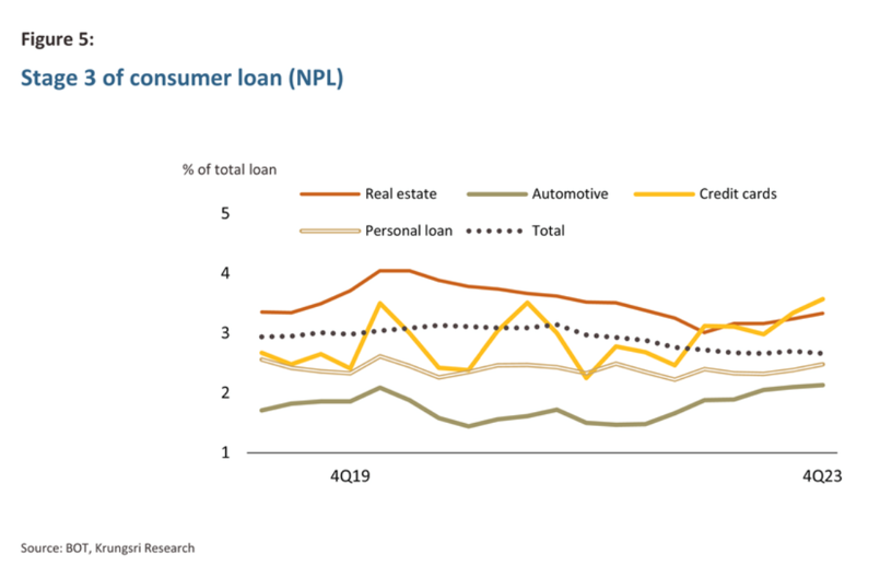 Thansin (2024) ได้เปรียบเทียบ % NPL ของสินเชื่อประเภทต่าง ๆ ที่ให้แก่ครัวเรือนดังแสดง ใน Figure 5 ก่อนที่จะเปรียบเทียบข้อมูลของไทยกับประเทศอื่น ๆ คงต้องระลึกไว้ถึงสภาพตลาดสินค้า ทางการเงินที่มีลักษณะคล้ายกัน สินค้าทางการเงินในไทยค่อนข้างจะเป็นไปโดยเสรีใกล้เคียงกับสหรัฐ อเมริกามากกว่าประเทศอื่น ๆ ที่เน้นการทำตลาดสินค้าทางการเงินกระจุกตัวไปที่ชนิดใดชนิดหนึ่ง อย่าง ออสเตรเลีย หรือ สิงคโปร์