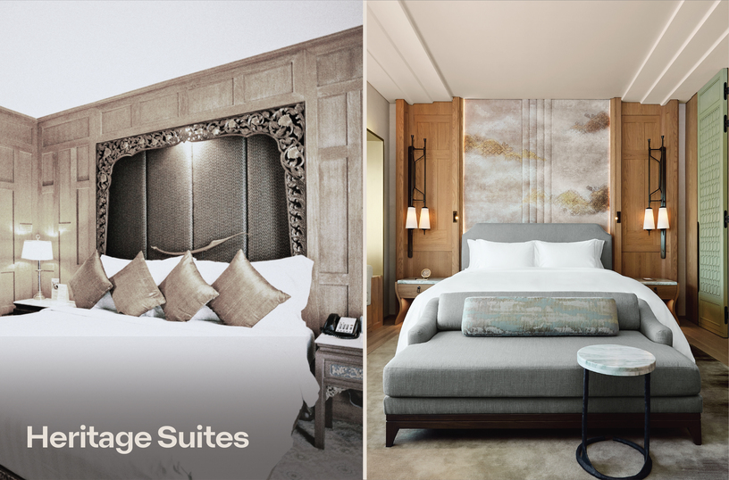 จากอดีตถึงปัจจุบัน ห้องสวีทที่โรงแรมดุสิตธานี กรุงเทพ นับว่าเป็นต้นแบบความเป็นไทยที่แท้จริงไม่ว่าชาวไทยหรือชาวต่างชาติ ต่างก็หลงใหลตั้งแต่แรกเข้าพัก โดยมีเอกลักษณ์ของการออกแบบบวกกับการตกแต่งห้องที่รังสรรค์อย่างประณีตบรรจงผ่านการสอดแทรกวัฒนธรรมและความเป็นอยู่อย่างไทยในแบบฉบับของโรงแรมดุสิตธานี กรุงเทพ อาทิ การนำเอาเอกลักษณ์ความเป็นไทยอย่างลายลูกฟักและผนังไม้ฝาปะกนบ้านไทยมาร่วมตกแต่งภายในห้อง ด้านบริเวณหัวเตียงที่ยังคงใส่ใจในรายละเอียดด้วยการเพิ่มลวดลายที่ปักด้วยมือทุกชิ้นสื่อความหมายถึงสรวงสวรรค์ และการเลือกใช้เฟอร์นิเจอร์ที่มีรูปร่างโค้งนุ่มนวลแบบไทยเพื่อทำให้องค์ประกอบของห้องดูร่วมสมัยมากขึ้น โดยการกลับมาใหม่ครั้งนี้ ห้องพักทั้ง 257 ห้องจะมีขนาดใหญ่ขึ้น และทั้งหมดสามารถมองเห็นความร่มรื่นของสวนลุมพินีได้อย่างเต็มตาผ่านช่องหน้าต่างที่เป็นกระจกบานใหญ่สูงจากพื้นจรดเพดาน ซึ่งตกแต่งด้วย ขอบสีทองหรูหราเพื่อสื่อถึงภาพความทรงจำที่น่าประทับใจ และยังเสริมความพิเศษด้วยพื้นที่พักกายชมวิวริมหน้าต่างเพื่อให้ ผู้พักอาศัยได้ผ่อนคลาย และชื่นชมความงดงามของธรรมชาติกับบรรยากาศอันแสนสงบจากภายในห้องพัก การตกแต่งภายในของโรงแรมดุสิตธานี กรุงเทพ ได้รับการออกแบบจาก André Fu Studio ซึ่งได้รับการยกย่องและเป็นที่ยอมรับในระดับสากล โดยการออกแบบได้คำนึงถึงความต่อเนื่องจากอดีตสู่ปัจจุบันอย่างลงตัว สื่อความหมายของคำว่า Heritage ได้อย่างสมบูรณ์