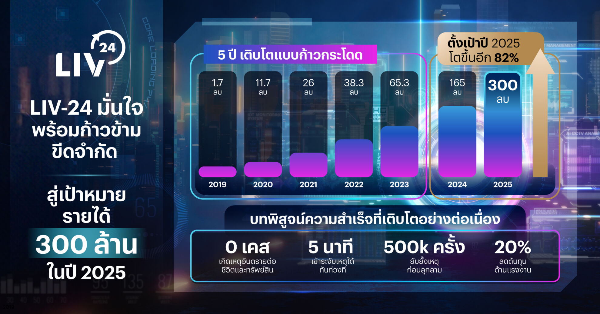 โดยLIV-24 เป็นผู้เชี่ยวชาญการออกแบบโซลูชันที่ตอบโจทย์ผู้ประกอบการได้ทุกรูปแบบ ดูแลครอบคลุมหลายธุรกิจกว่า130 โครงการ ผ่านมาแล้ว 500,000 เคส และมีเคสอันตรายที่เกิดกับชีวิตและทรัพย์สินเป็น 0 เคส รวมทั้งเป็น