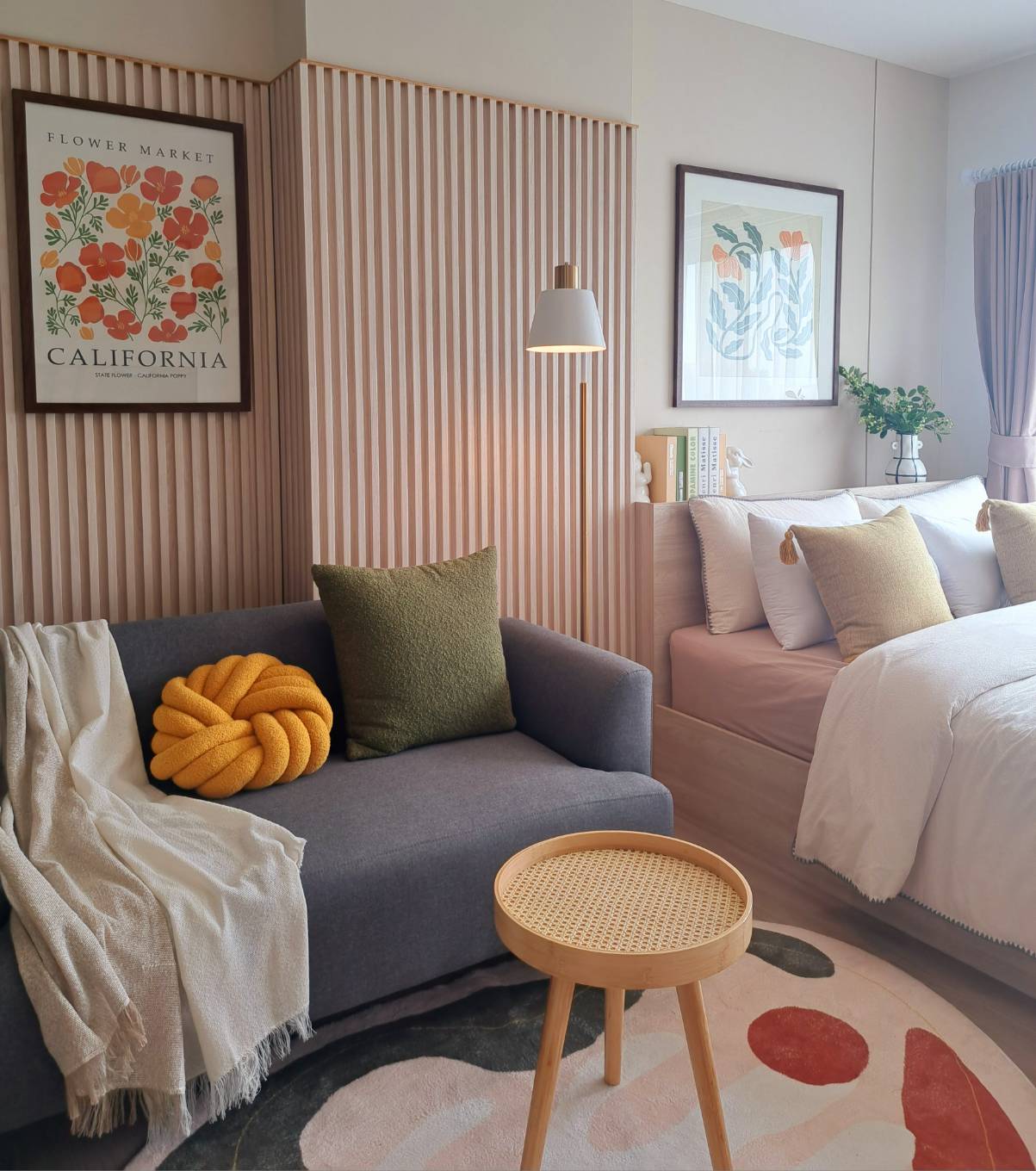 โดยแปลนห้องชุดแบบสตูดิโอ จัดวางตำแหน่งของครัวและห้องน้ำไว้ด้านหน้า พื้นที่ตรงกลางเป็น Living และเตียงนอนที่อยู่ติดกับผนังแบบกระจกและพื้นที่ระเบียง ส่วนแปลนห้องชุดแบบ 1ห้องนอน จะวางตำแหน่งพื้นที่ Living และ Dining Areaไว้ด้านหน้า เชื่อมต่อกับห้องนอนที่กั้นเป็นสัดส่วนด้วยประตูกระจกแบบบานเลื่อนทรงสูง ส่วนพื้นที่อีกส่วนจัดแบ่งเป็นห้องน้ำ ห้องครัว และระเบียง
