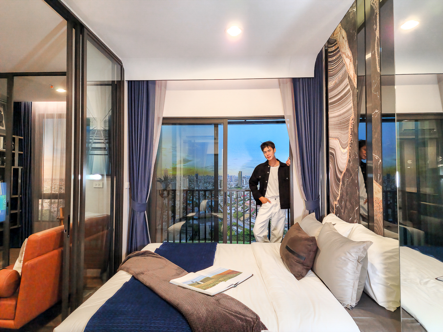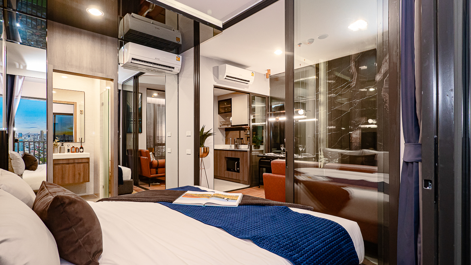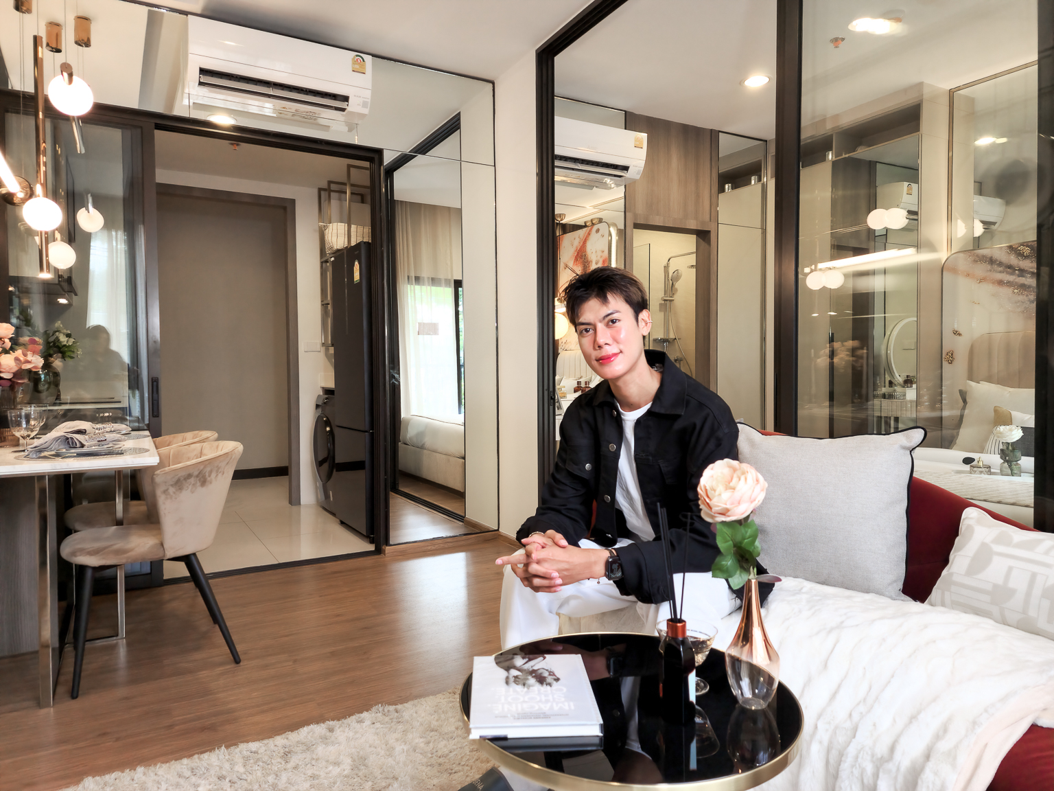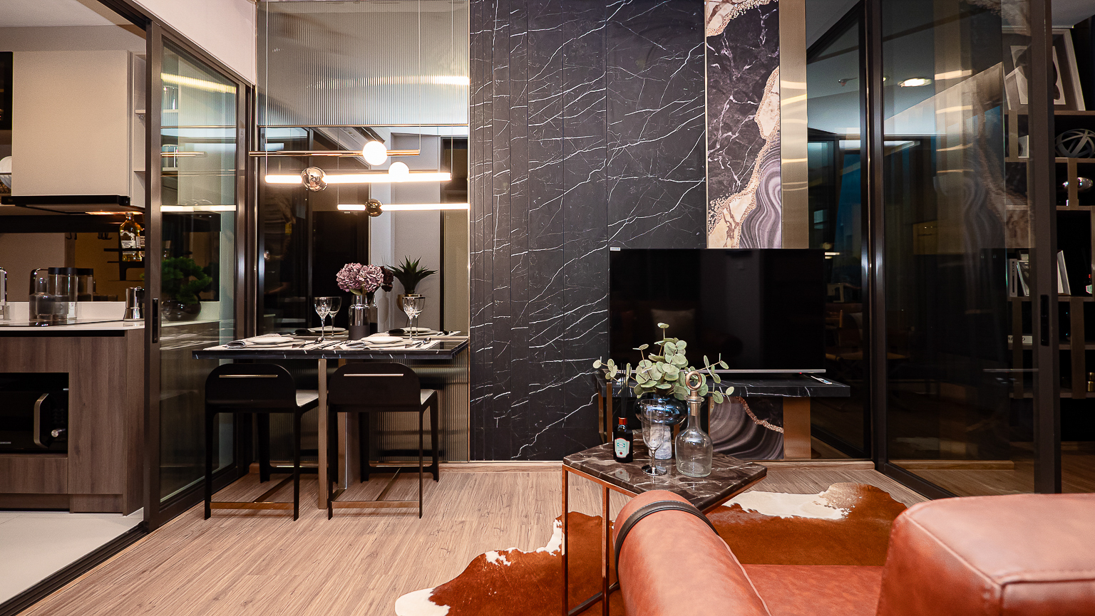 ส่วน Living Area และห้องนอน แบ่งกันพื้นที่ด้วยประตูกระจกบานสไลด์ 3 ตอน สามารถปรับเปลี่ยนพื้นที้ได้ตามความต้องการใช้งาน หากอยู่ 2 คนก็จะเลื่อนปิดหากอีกคนอยากนอนพักผ่อน