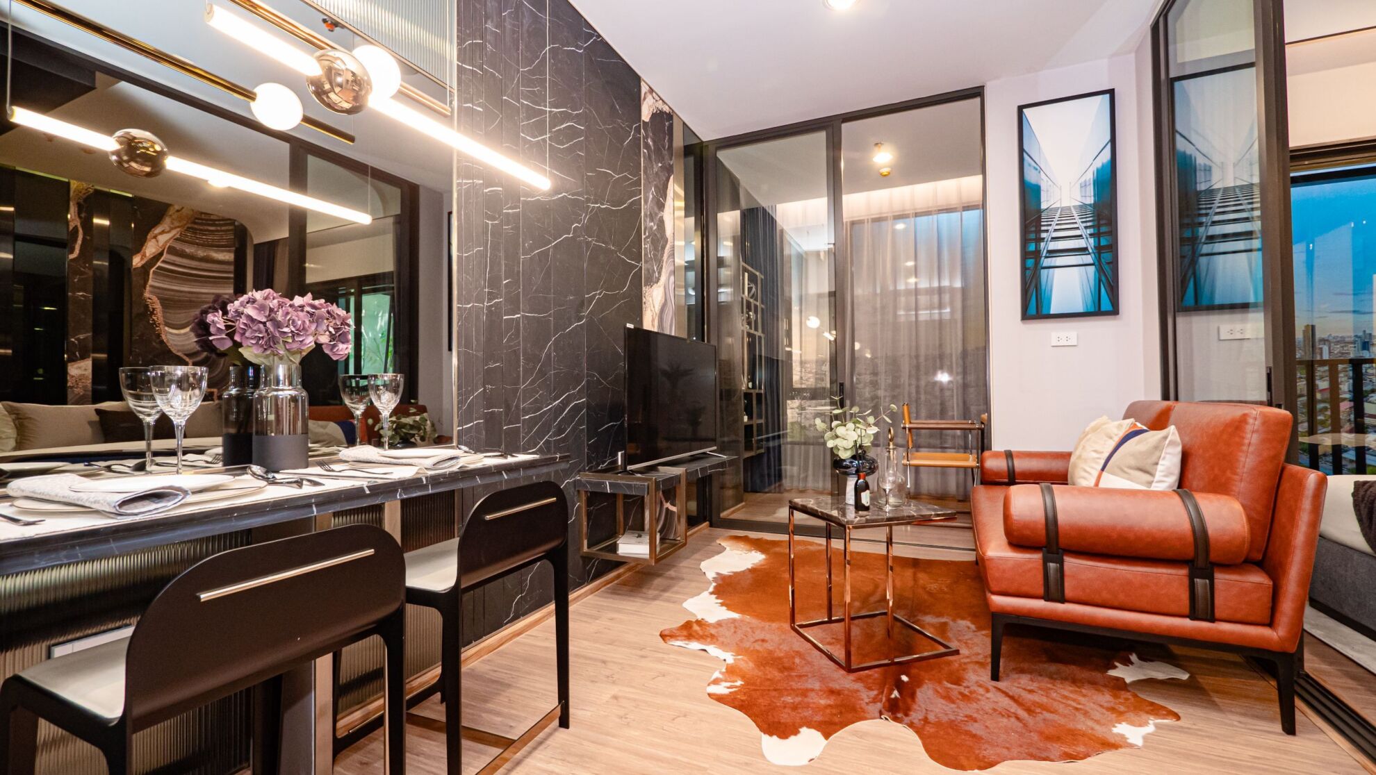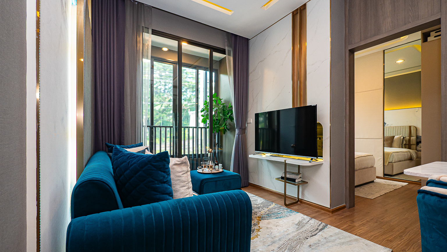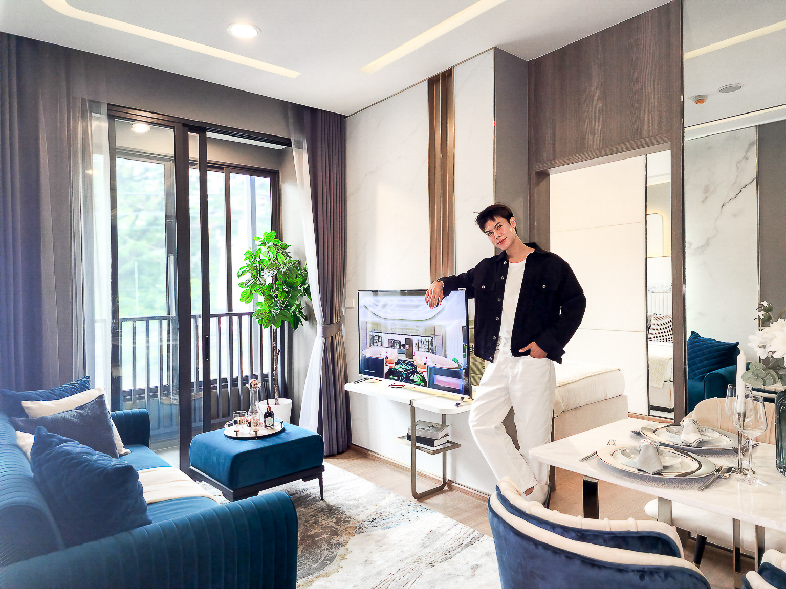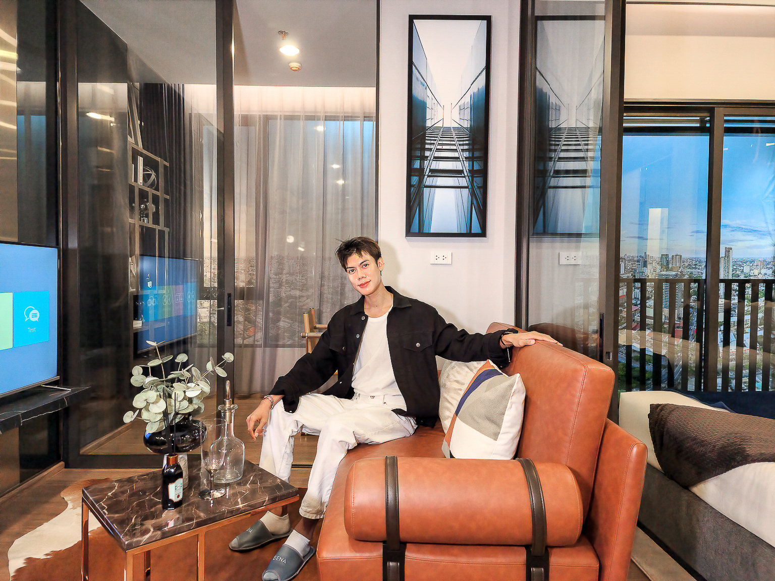 ส่วน Living Area และห้องนอน แบ่งกันพื้นที่ด้วยประตูกระจกบานสไลด์ 3 ตอน สามารถปรับเปลี่ยนพื้นที้ได้ตามความต้องการใช้งาน หากอยู่ 2 คนก็จะเลื่อนปิดหากอีกคนอยากนอนพักผ่อน