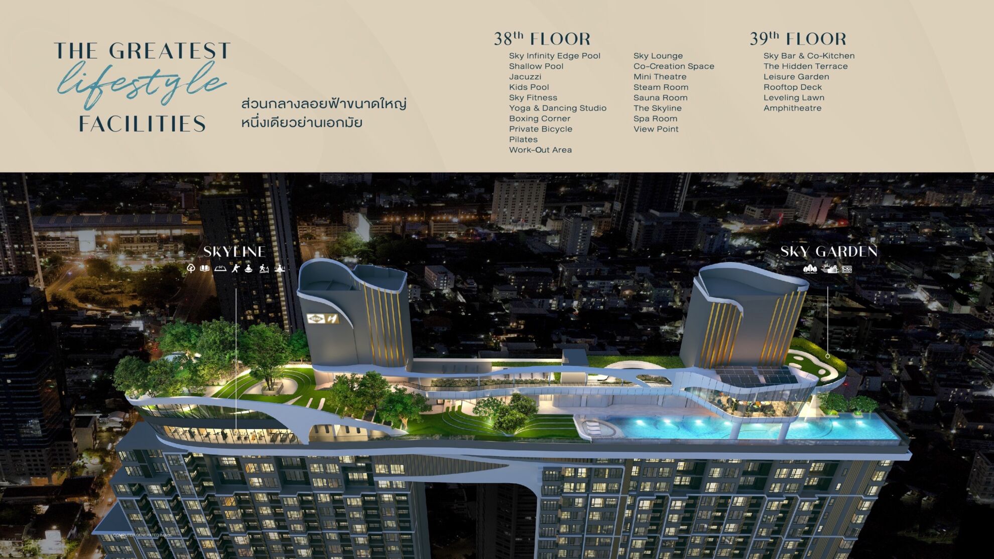 ชั้น 38 เอาใจลูกบ้านสาย Active จัดเต็มให้พื้นที่ลูกบ้านได้ทำกิจกรรมทั้ง Sky Infinity Edge Pool, Shallow Pool, Kids Pool, Sky Fitness, Yoga&Dancing Studio, Boxing Conner, Private Bicycle, Pilates, Workout Area, Sky Lounge, Co-Creation Space, Mini Theatre, Steam Room, Sauna Room, The Skyline, Spa Room, View Point