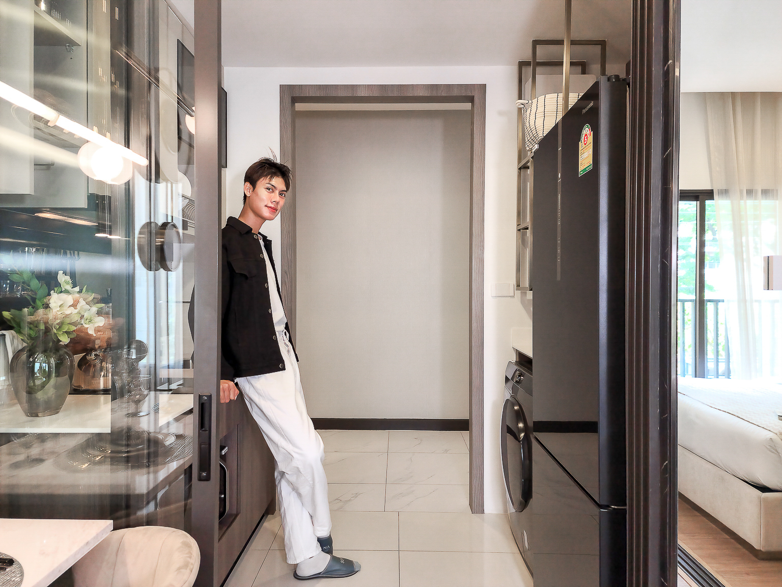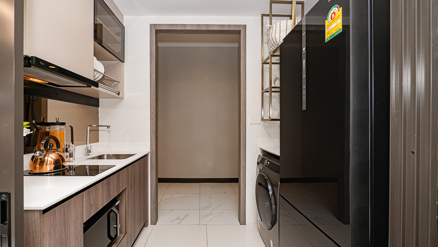 ฝั่งตรงข้ามเคาน์เตอร์ครัวจะเป็นพื้นที่สำหรับวางตู้เย็นและเครื่องซักผ้า ทางโครงการติดตั้งงานระบบมาไว้ให้พร้อม