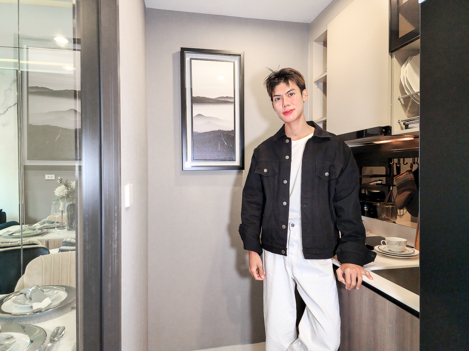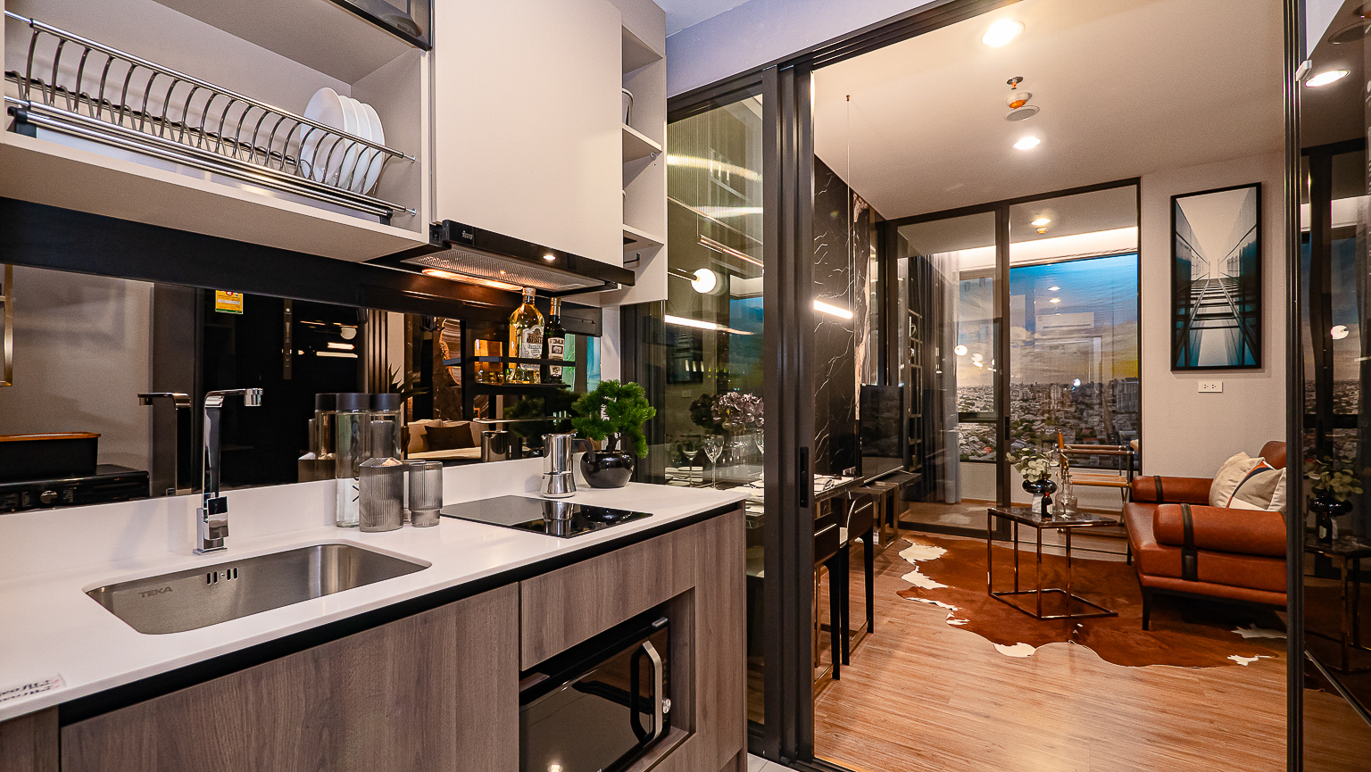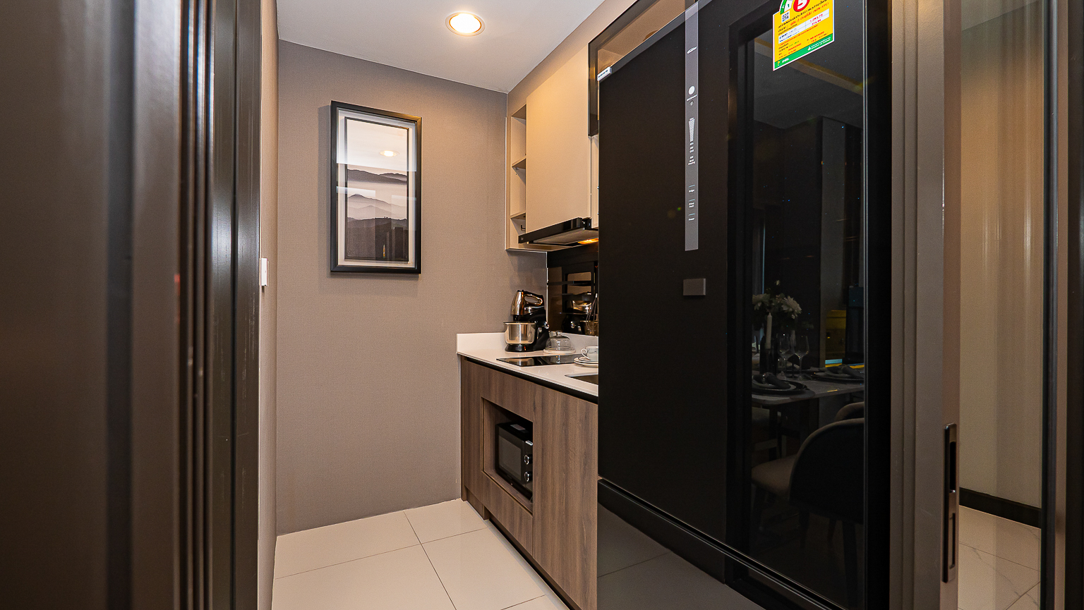 สำหรับห้อง Type นี้ส่วนแรกด้านซ้ายคือ ห้องครัวปิด ได้เป็นประตูกระจกบานเลื่อน เวลาทำอาหารสามารถปิดประตูเพื่อป้องกันกลิ่นได้ ด้านในครัวสามารถวางตู้เย็นหลังใหญ่ได้
