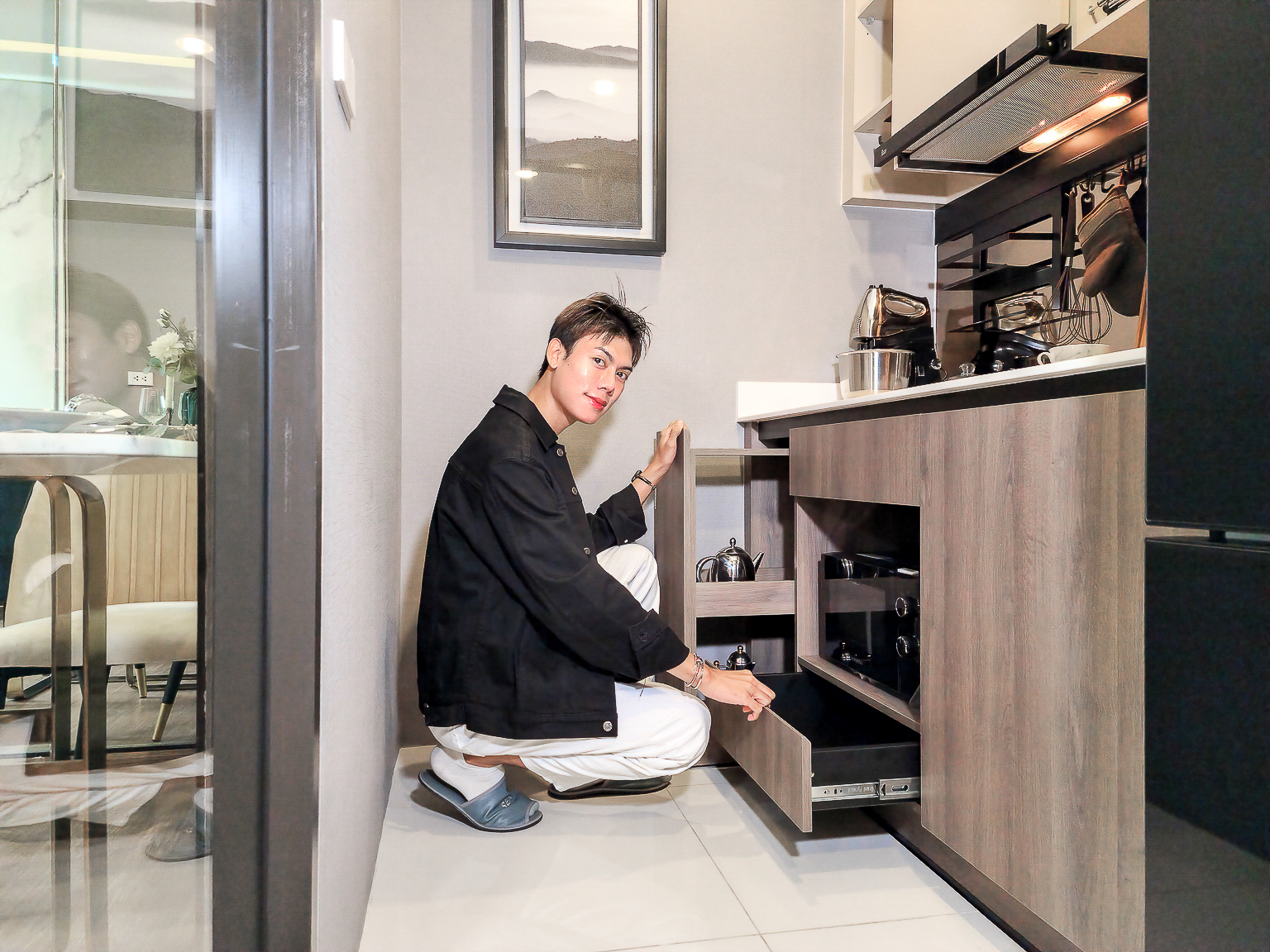 ส่วนแรกที่เข้ามาคือห้องครัวปิด โครงการเลือกเอาครัวมาไว้ด้านหน้า และเป็นครัวปิดเพื่อการใช้งานที่สะดวกเข้าห้องมาสามารถล้างมือที่ซิงค์ ก่อนจะหยิบจับของภายในบ้าน โครงการให้ชุดครัวบิ้วอิน มี ฮอป ฮูด ซิงค์ ตู้เก็บของด้านบนสามารถเก็บของได้เยอะ และมีชั้นสำหรับวางจาน