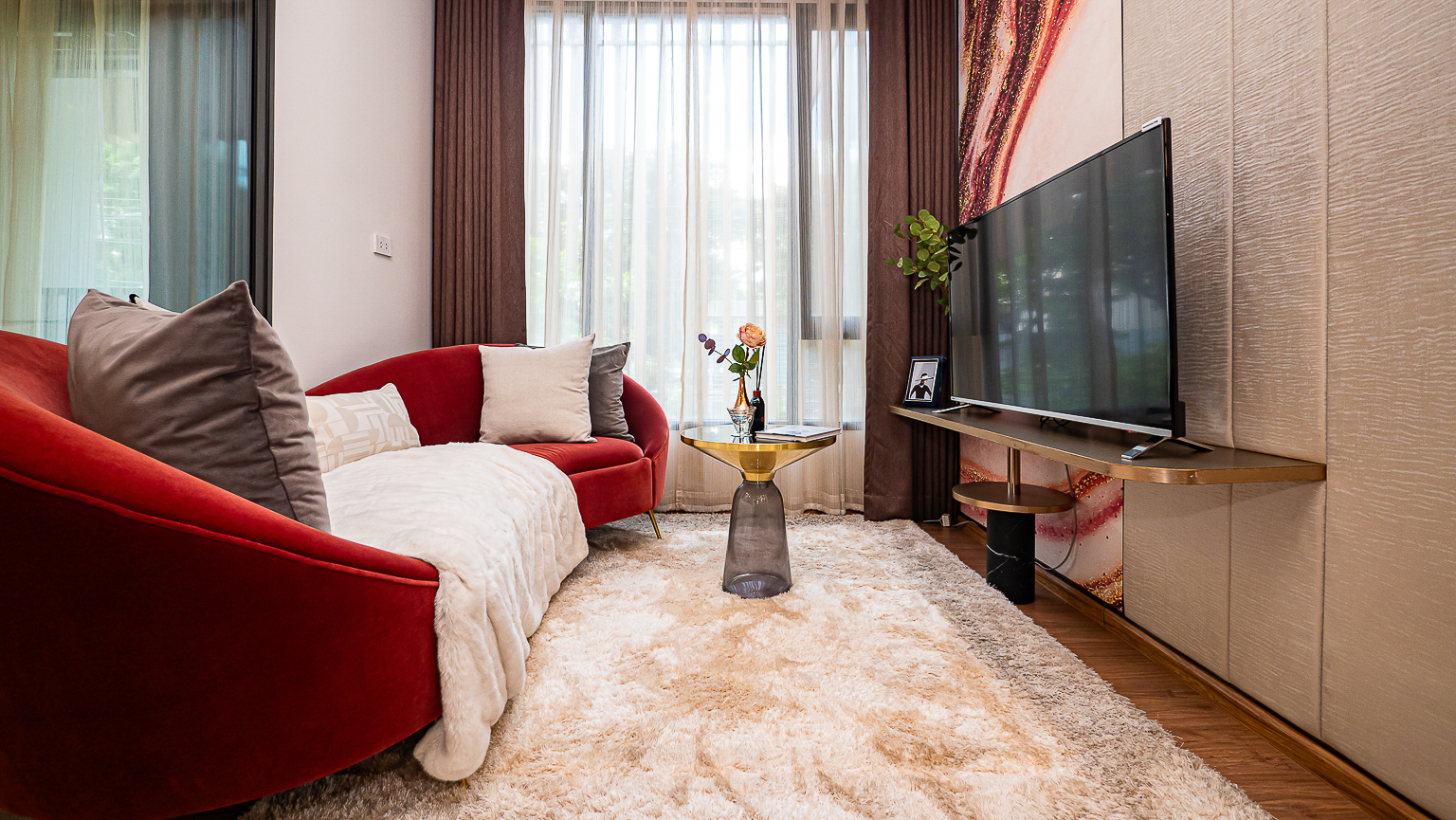 Living Area ติดหน้าต่างสามารถวางโซฟาขนาด 2 ที่นั่ง พร้อมโต๊ะกลางเข้าชุด ได้ เป็นมุมนั่งพักผ่อน ดูทีวี สามารถเทควิวเอกมัยจากหน้าต่างห้องได้เลย ฝั่งตรงข้ามวางโต๊ะสำหรับวางทีวี หรืออยากประหยัดพื้นที่สามารถติดทีวีแบบแขวนผนังได้