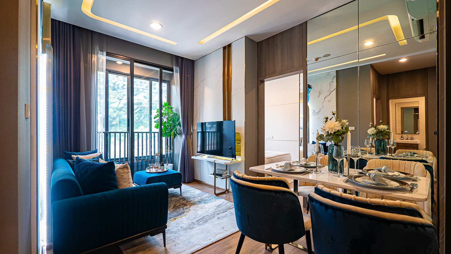 ส่วนถัดมาคือ Living Area โครงการวางชุดโต๊ะรับประทานอาหาร และชุดโซฟาขนาด 2 ที่นั่งไว้เป็นตัวอย่าง