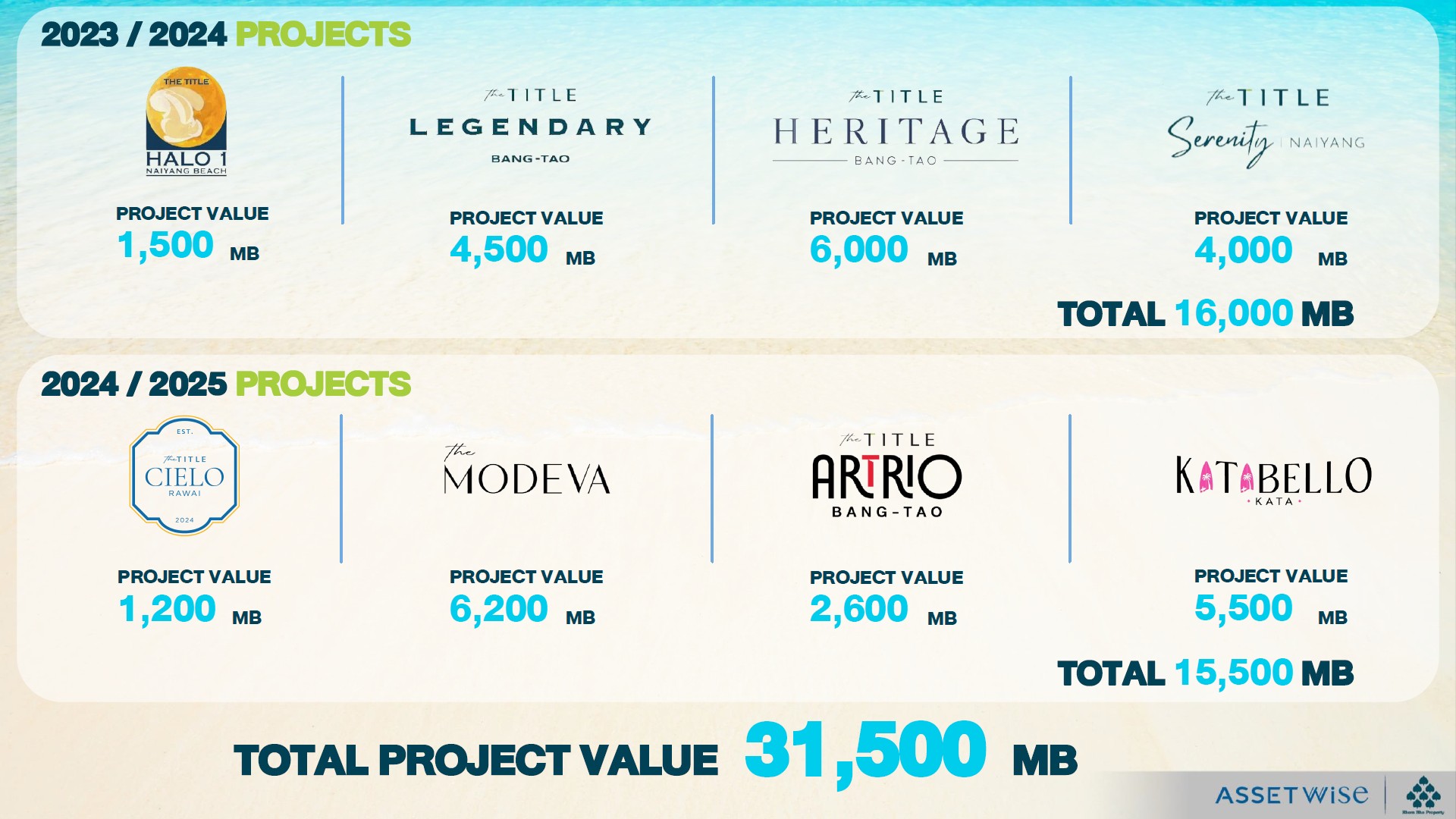 1.เดอะ ไทเทิล เชียโล่ ราไวย์ (THE TITLE CIELO RAWAI) มูลค่า 1,200 ล้านบาท ซึ่งได้รับการตอบรับอย่างดีเยี่ยมจนมียอดขายถึง 90% หลังเปิดขายได้เพียง 1 สัปดาห์