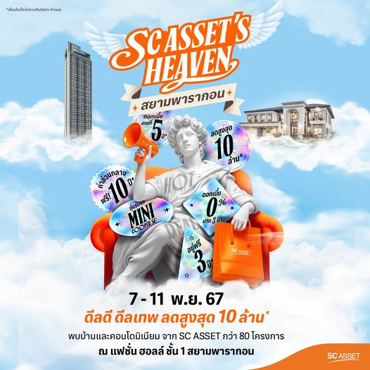 บริษัท เอสซี แอสเสท คอร์ปอเรชั่น จำกัด (มหาชน) หรือ SC ประกาศความสำเร็จจากงานมหกรรมบ้านและคอนโด ที่จัดขึ้นระหว่าง 31 ต.ค. – 3 พ.ย. 67 ณ ศูนย์ประชุมแห่งชาติสิริกิติ์ ที่ผ่านมา โกยยอดขายทะลุเป้ากว่า 1,000 ล้านบาท หนุนยอดขายสะสมตั้งแต่ต้นไตรมาส 4 ถึงปัจจุบันสูงกว่า 4,500 ล้านบาท พร้อมลุยต่อ งาน SC Asset’s Heaven @Siam Paragon #ดีลดีดีลเทพ #จบบูธนี้ไม่มีอีกแล้ว ครั้งสุดท้าย! ราคาเริ่ม 2.59-100 ล้านบาท มอบส่วนลดพิเศษสูงสุดถึง 10 ล้านบาท* ฟรี! ค่าส่วนกลางสูงสุด 10 ปี* , ดอกเบี้ย 0% นาน 3 ปี* รับของพรีเมียมทันทีเมื่อจองในงาน, ดอกเบี้ยคงที่ 5 ปี* , พิเศษสุด! จองในงานนี้ลุ้นรับ Mini Cooper SE มูลค่า 1,699,000 บาท ระหว่างวันที่ 7-11 พฤศจิกายน 2567 รอบ Final Call พบข้อเสนอดีที่สุดส่งท้ายปีที่ ณ แฟชั่น ฮอลล์ ชั้น 1 สยามพารากอน ยกขบวนบ้านหรู และคอนโดมีเนียม Ready to move-in รวมกว่า 80 โครงการ พร้อมราคาที่ดี จนเหล่าเทพยังต้องเหลียว กับโปรโมชั่นและดีลพิเศษมากมาย ให้ทุกคนได้มีบ้านในฝัน ดีไซน์สวย คุณภาพดี ตรงความต้องการทุกกลุ่มลูกค้า ที่กำลังมองหาที่อยู่อาศัยคุณภาพ