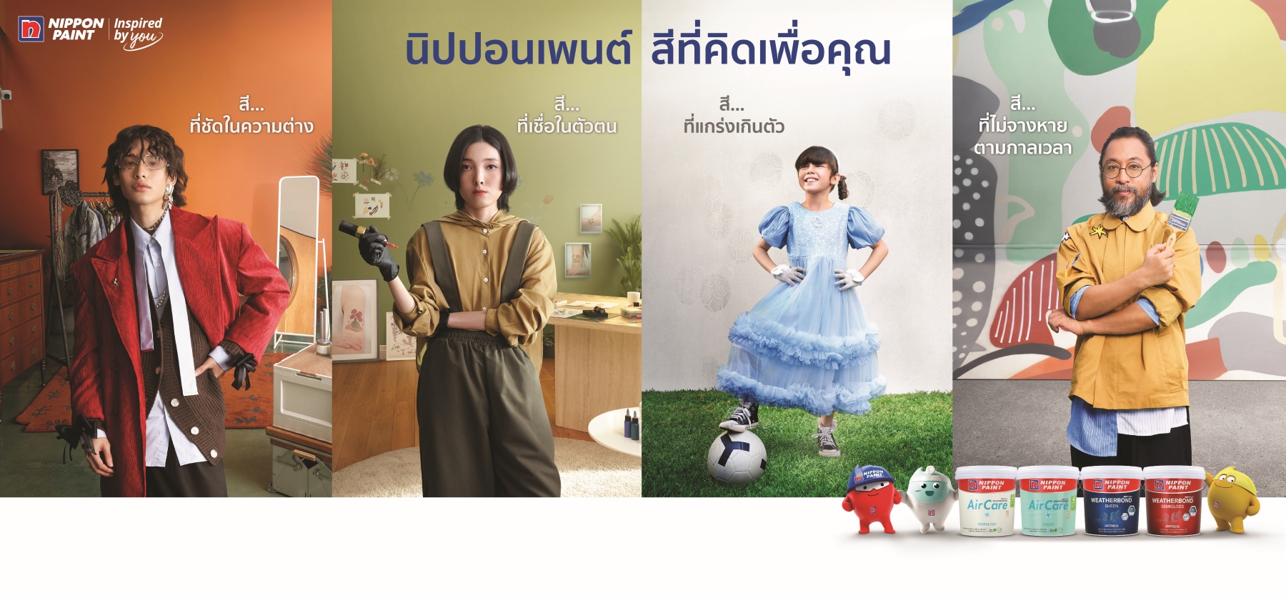 แนวคิด “Inspired by you: สีที่คิดเพื่อคุณ” จึงสะท้อนสู่การสร้างแคมเปญการตลาดเพื่อปรับภาพลักษณ์ครั้งใหญ่ของนิปปอนเพนต์ในปีนี้ โดยมีการผลิตชุดภาพยนตร์โฆษณา “สีที่คิดเพื่อคุณ” เพื่อสื่อสารถึงจุดยืนของแบรนด์ว่าเป็นสีที่ “ยึดความต้องการของผู้บริโภคเป็นที่ตั้ง” (Customer Centric) สร้างการจดจำว่านิปปอนเพนต์คือสีที่เข้าใจความแตกต่างหลากหลายของตัวตนและบุคลิกของลูกค้า รวมถึงนิปปอนเพนต์ไม่เพียงแต่มีความเชี่ยวชาญด้านนวัตกรรมผลิตภัณฑ์สี แต่ยังสามารถนำความเชี่ยวชาญนั้นมาตอบสนองลูกค้าทุกกลุ่มได้ตรงใจ แก้ปัญหาให้ลูกค้าได้ตรงจุด ตอบโจทย์ทุกสีสันที่จะสร้างสรรค์โลกให้สวยงาม โดยกลุ่มเป้าหมายของแคมเปญเน้นหนักที่กลุ่มลูกค้าทั่วไป พร้อมขยายการรับรู้เป็นวงกว้างทั้งกลุ่ม Gen X, Gen Y จนถึง Gen Z ผ่านการใช้เครื่องมือทางการตลาดแบบ 360 องศา ครบทั้งสื่อวิทยุ สื่อนอกบ้าน (Out of Home) อินฟลูเอนเซอร์ หรือ KOLs และโซเชียลมีเดียทุกช่องทางตาม Customer Journey ของกลุ่มลูกค้าเป้าหมาย