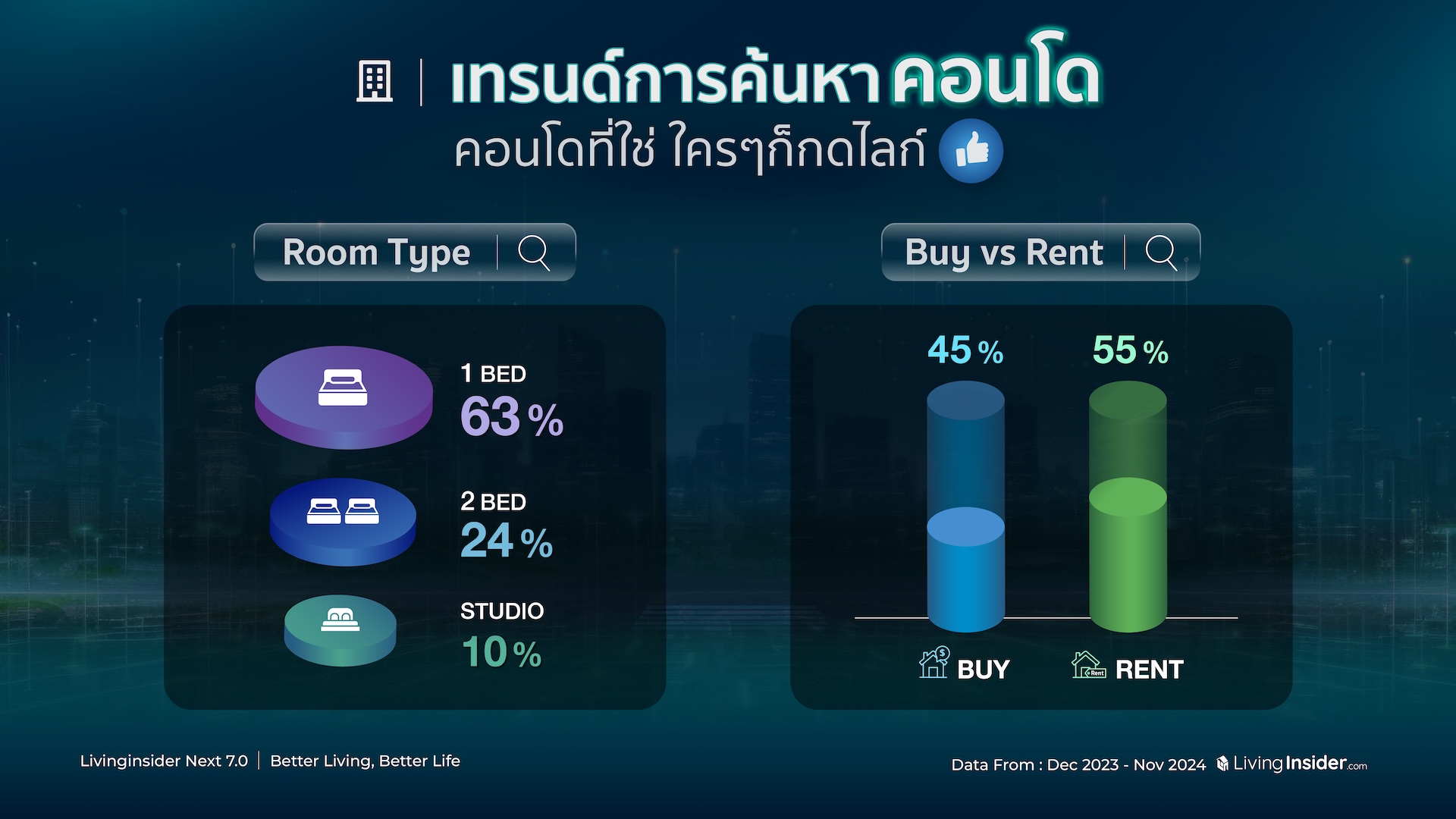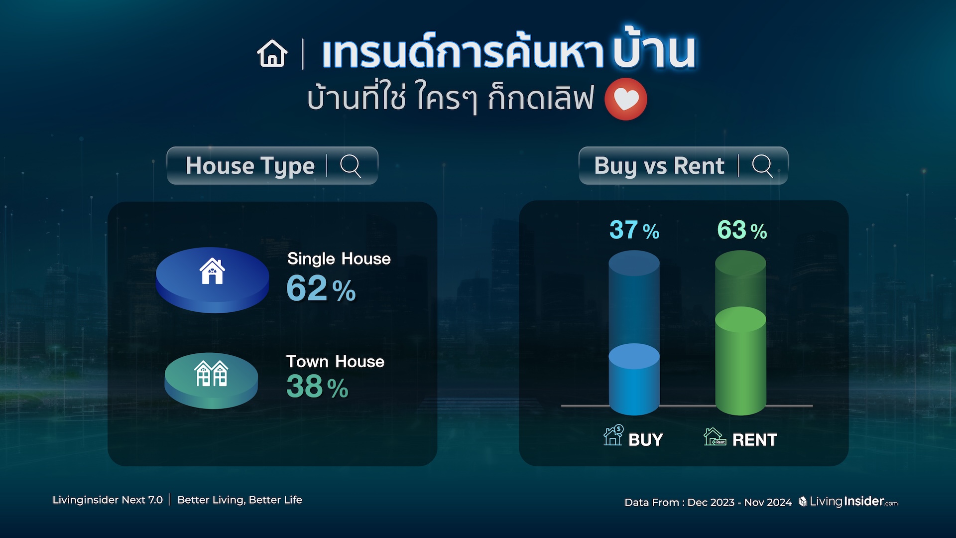 PropTech&Living trends เทรนด์ที่เปลี่ยนแปลง กับเทคโนโลยีที่เปลี่ยนไปว่า ในปี 2567 Livinginsider.com มีการเติบโตอย่างต่อเนื่อง แสดงให้เห็นถึงความต้องการ และความสนใจในตลาดอสังหาฯ ของกลุ่มผู้บริโภคที่ยังคงมีต่อเนื่อง โดยจากข้อมูลสถิติบนเว็บไซต์ Livinginsider.com ช่วงปี 2566-2567 พบว่า การค้นหาประกาศอสังหาฯ ให้เช่าเติบโตขึ้นถึง 13%จากปีที่ผ่านมา ขณะที่หมวดหมู่การซื้อปรับตัวลดลงกว่า 20% โดยผู้เข้าเยี่ยมชมส่วนใหญ่สนใจที่อยู่อาศัยประเภทคอนโดมิเนียมสูงถึง 74% ส่วนบ้านจัดสรรมีสัดส่วนเพียง 26%สำหรับรูปแบบห้องชุดที่ได้รับความนิยมสูงสุด ได้แก่ ห้องชุดขนาด 1 ห้องนอน มีสัดส่วน 63% รองลงมาเป็นห้องชุด 2 ห้องนอน 24% และแบบสตูดิโอ 10% โดยการค้นหาคอนโดฯ ส่วนใหญ่เป็นการเช่า 55% และการซื้อ 45% ส่วนความต้องการที่อยู่อาศัยประเภทบ้านแนวราบ พบว่า บ้านเดี่ยวยังคงครองใจคนส่วนใหญ่ โดยมีสัดส่วนการค้นหามากถึง 62% เทียบกับทาวน์เฮ้าส์และบ้านแฝดที่มีสัดส่วน 38% ทั้งนี้เป็นการค้นหาในหมวดหมู่การเช่าสูงถึง 63% และการซื้อ 37% สะท้อนให้เห็นว่าความยืดหยุ่นทางการเงินยังคงเป็นปัจจัยสำคัญในการเลือกที่อยู่อาศัยในยุคปัจจุบัน