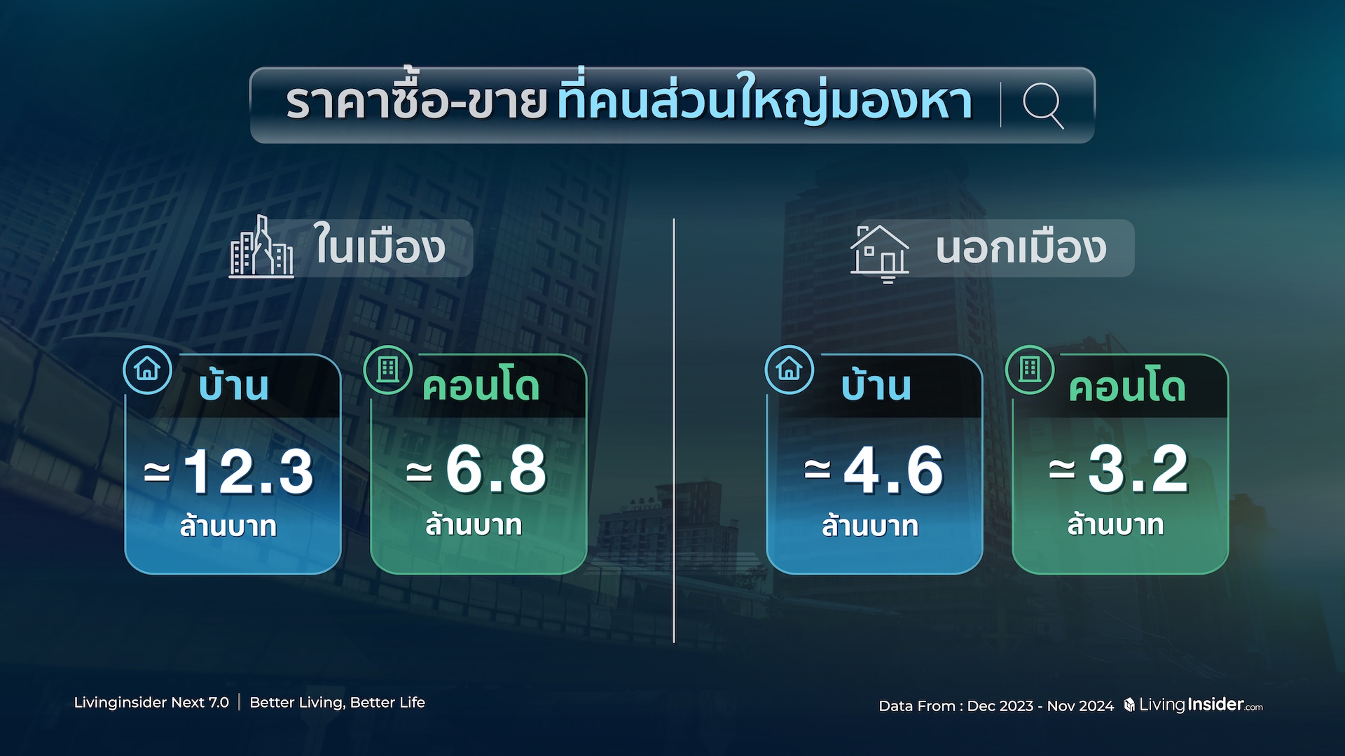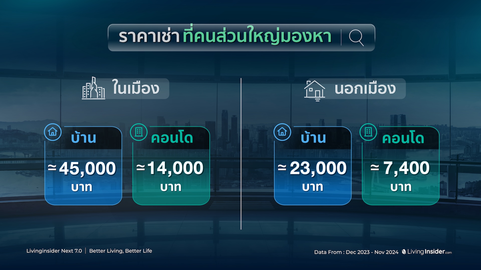 ด้านงบประมาณการซื้อที่อยู่อาศัยที่คนส่วนใหญ่มองหาในทำเลกรุงเทพฯ และปริมณฑล คือ บ้านจัดสรรราคาเฉลี่ยประมาณ 12.3 ล้านบาท และคอนโดฯ ราคา 6.8 ล้านบาท ส่วนในต่างจังหวัด จะเป็นกลุ่มบ้านราคาเฉลี่ย 4.6 ล้านบาท และคอนโดฯ ราคา 3.2 ล้านบาท ขณะที่งบประมาณสำหรับการเช่าที่คนส่วนใหญ่มองหาในทำเลกรุงเทพฯ และปริมณฑล จะเป็นบ้านที่มีค่าเช่าเฉลี่ยประมาณ 45,000 บาทต่อเดือน และคอนโดฯ 14,000 บาทต่อเดือน ส่วนงบประมาณสำหรับการเช่าในต่างจังหวัด จะเป็นบ้านที่มีค่าเช่าเฉลี่ย 23,000 บาทต่อเดือน และคอนโดฯ ราคา 7,400 บาทต่อเดือน