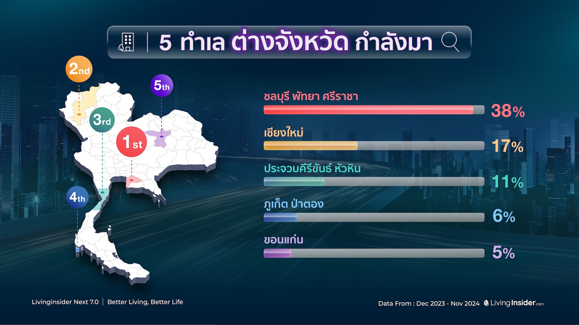 ด้าน 5 อันดับทำเลต่างจังหวัดที่มีการค้นหาที่อยู่อาศัยมากที่สุด ได้แก่ อันดับ 1 ชลบุรี พัทยา ศรีราชา เนื่องจากมีชาวต่างชาติอาศัยอยู่เป็นจำนวนมาก และเป็นที่ตั้งของนิคมอุตสาหกรรมหลายแห่ง ทำให้มีผู้อยู่อาศัยและความต้องการซื้อมากขึ้น, อันดับ 2 เชียงใหม่, อันดับ 3 หัวหิน ประจวบคีรีขันธ์ ปราณบุรี, อันดับ 4 ภูเก็ต