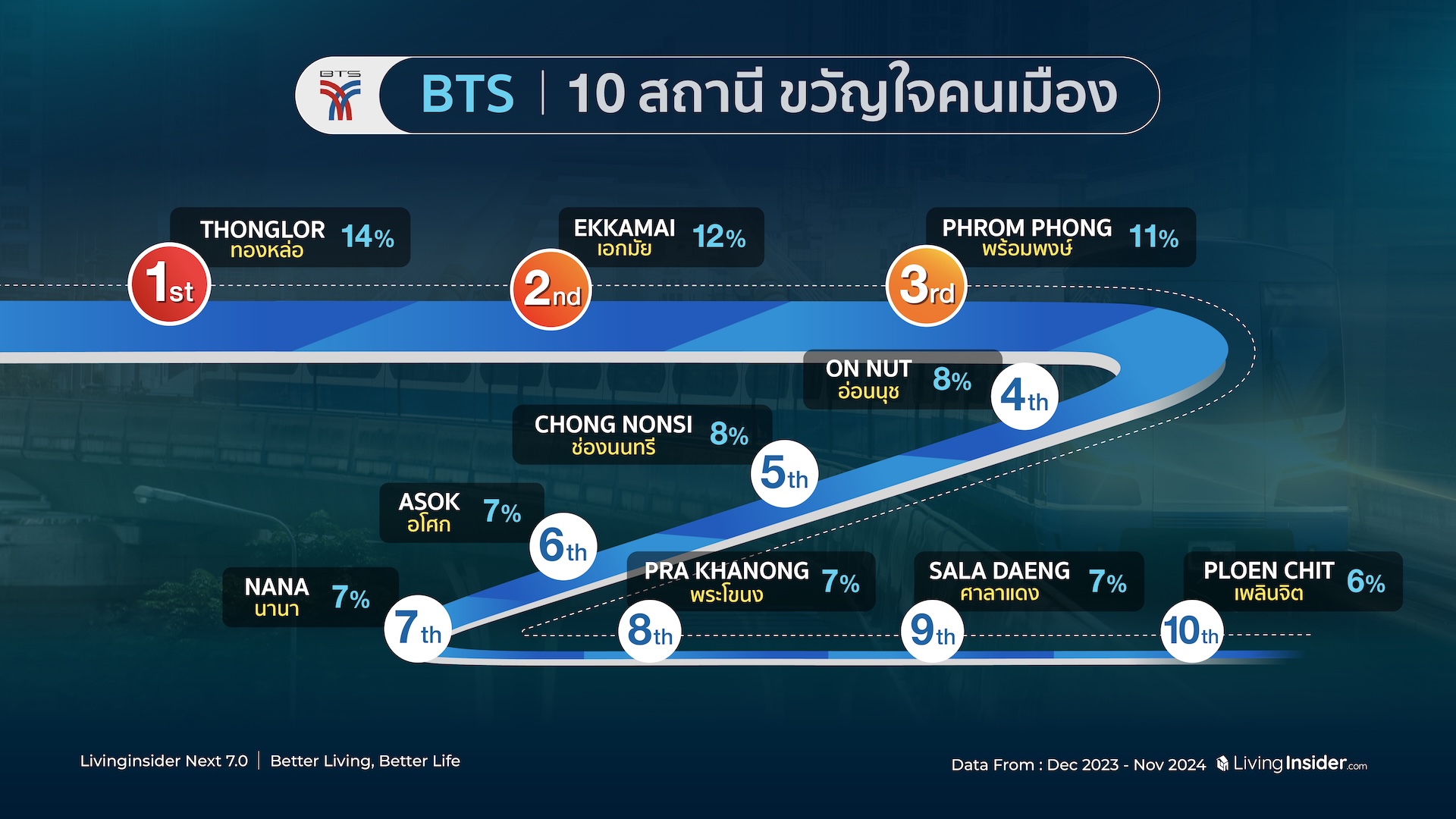 สำหรับการอยู่อาศัยของคนเมือง การอยู่อาศัยในทำเลใกล้รถไฟฟ้านับเป็นปัจจัยสำคัญอย่างมาก แม้ว่าปัจจุบันจะมีรถไฟฟ้าเปิดให้บริการหลายสาย แต่คนส่วนใหญ่ยังคงเลือกซื้อที่อยู่อาศัยใกล้รถไฟฟ้า BTS สายสีเขียวมากที่สุด โดยสถานีที่ได้รับความนิยมมากที่สุด 5 อันดับ ได้แก่ อันดับ 1 ทองหล่อ, อันดับ 2 เอกมัย, อันดับ 3 พร้อมพงษ์, อันดับ 4 อ่อนนุช และอันดับ 5 ช่องนนทรี