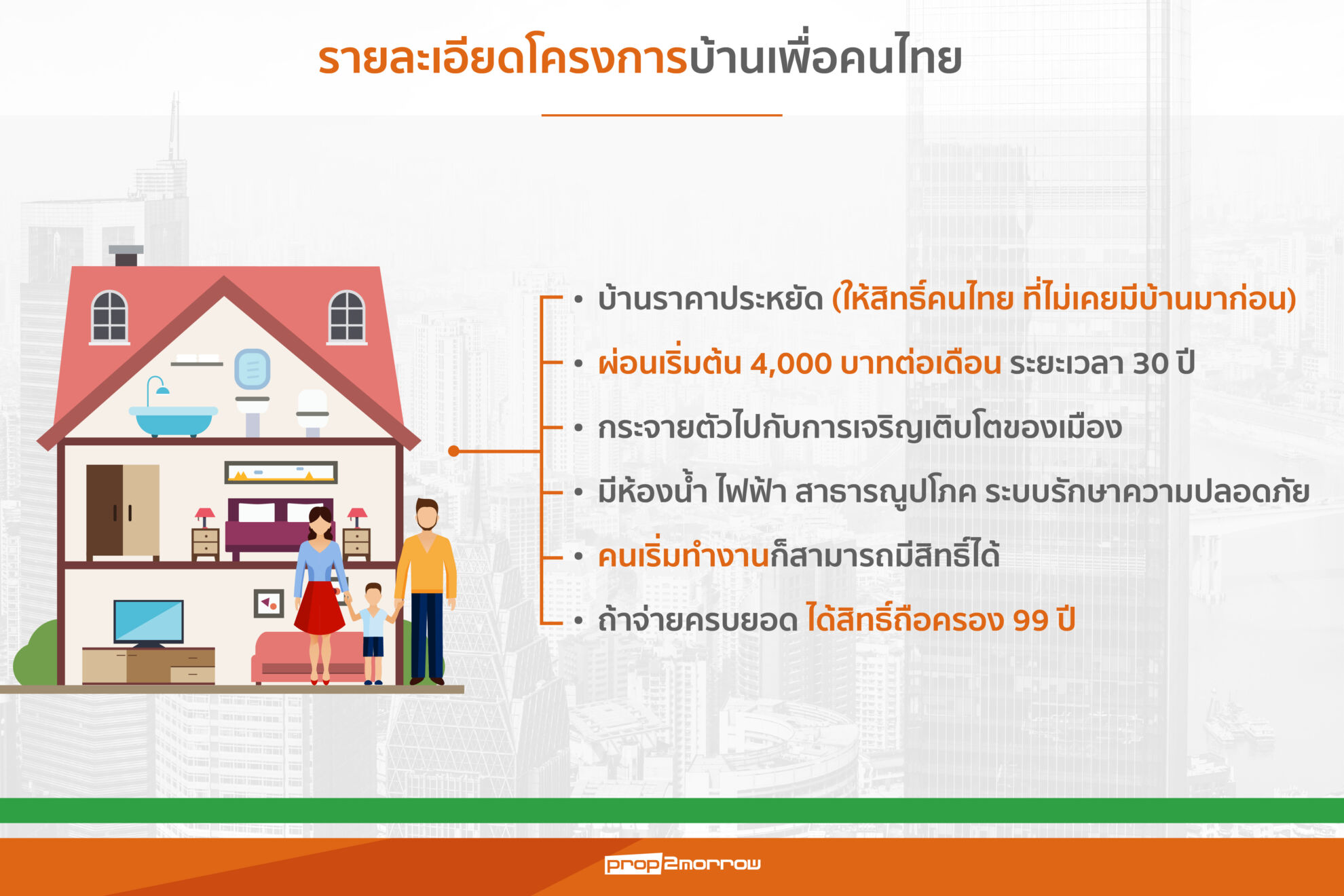 โครงการบ้านเพื่อคนไทย เป็นการพัฒนาที่อยู่อาศัยราคาประหยัด หรือ Affordable Housing โดยมีเป้าหมายในการพัฒนาที่พักอาศัยคุณภาพสูง ในพื้นที่ศักยภาพ ทั้งบ้านเดี่ยว และคอนโดมิเนียมขนาดพื้นที่ใช้สอยเริ่มต้นที่ 30 ตารางเมตร พร้อมสาธารณูปโภคครบครันและทันสมัย มีระบบการรักษาความปลอดภัยและเทคโนโลยีอื่นๆ เพื่อรองรับกลุ่มคนทำงาน ตั้งอยู่ในทำเลศักยภาพ ใกล้รถไฟฟ้า ผ่อนถูก ไม่ต้องดาวน์ อัตราการผ่อนชำระเริ่มที่ประมาณ 4,000 บาทต่อเดือน ระยะเวลาผ่อน 30 ปีในการครอบครองสิทธิถือครอง 99 ปี