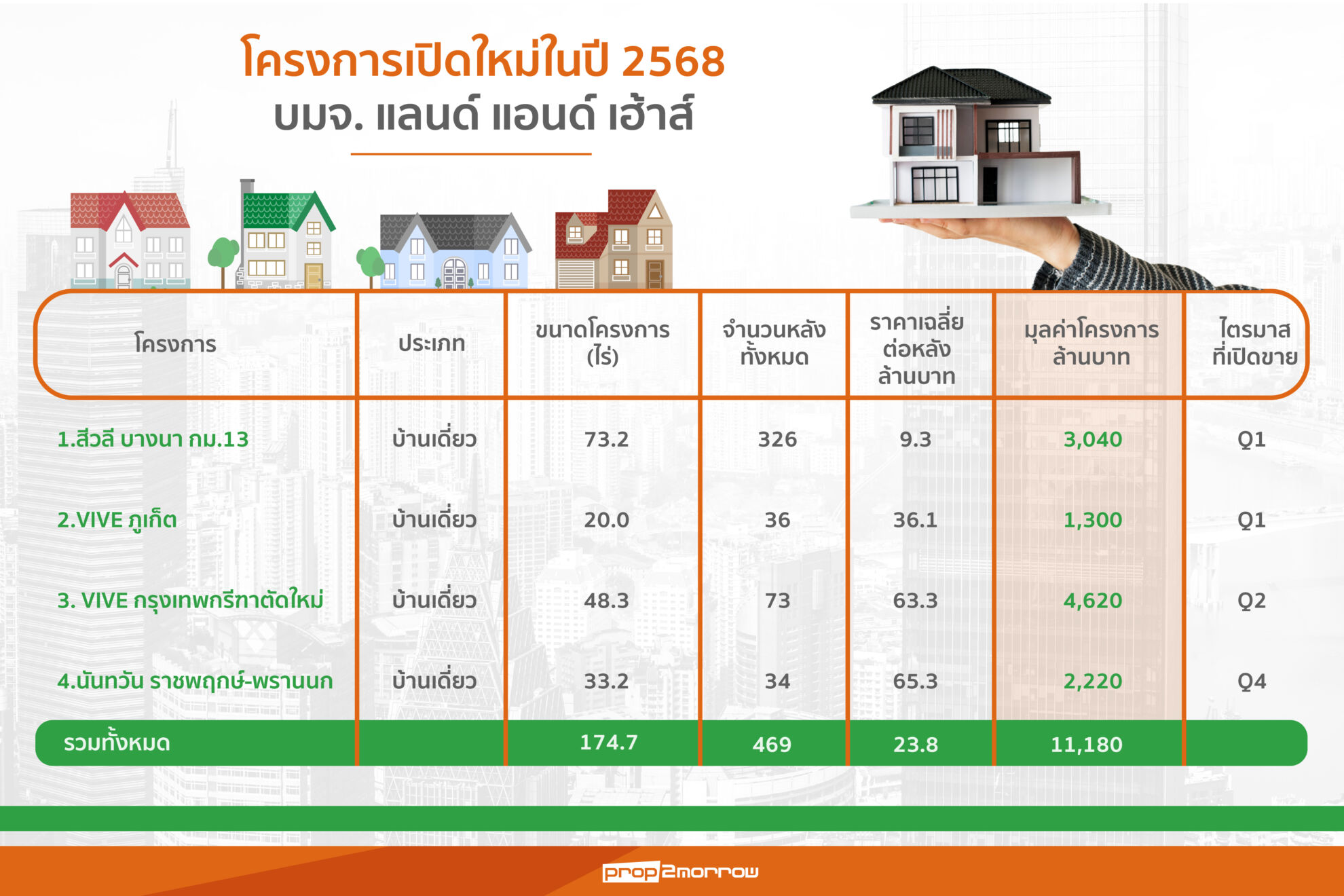 แลนด์ แอนด์ เฮ้าส์ เปิดตัวบ้านเดี่ยว 4 โครงการใหม่ระดับกลาง-บน มูลค่ารวม 11,180 ล้านบาท ลดลงมากถึง 64% เมื่อเทียบกับปี 2567 ระดับราคาขาย 8 – 80 ล้านบาทแบรนด์ VIVE นันทวัน และสีวลี ราคาขายเฉลี่ยต่อหน่วย 10.5 ล้านบาท เหตุมีสินค้าคงเหลือขายในระดับที่เพียงพอรองรับเป้ารายได้ 29,240 ล้านบาท และยอดขาย 23,000 ล้านบาท ส่วนช่วงเดือนเมษายนเตรียมเปิดตัวโครงการใหม่ Grande Centre Point Lumphini อาคาร Mixed Use มีทั้งพื้นที่สำนักงานประมาณ 12,700 ตารางเมตร. และโรงแรม 512 ห้อง