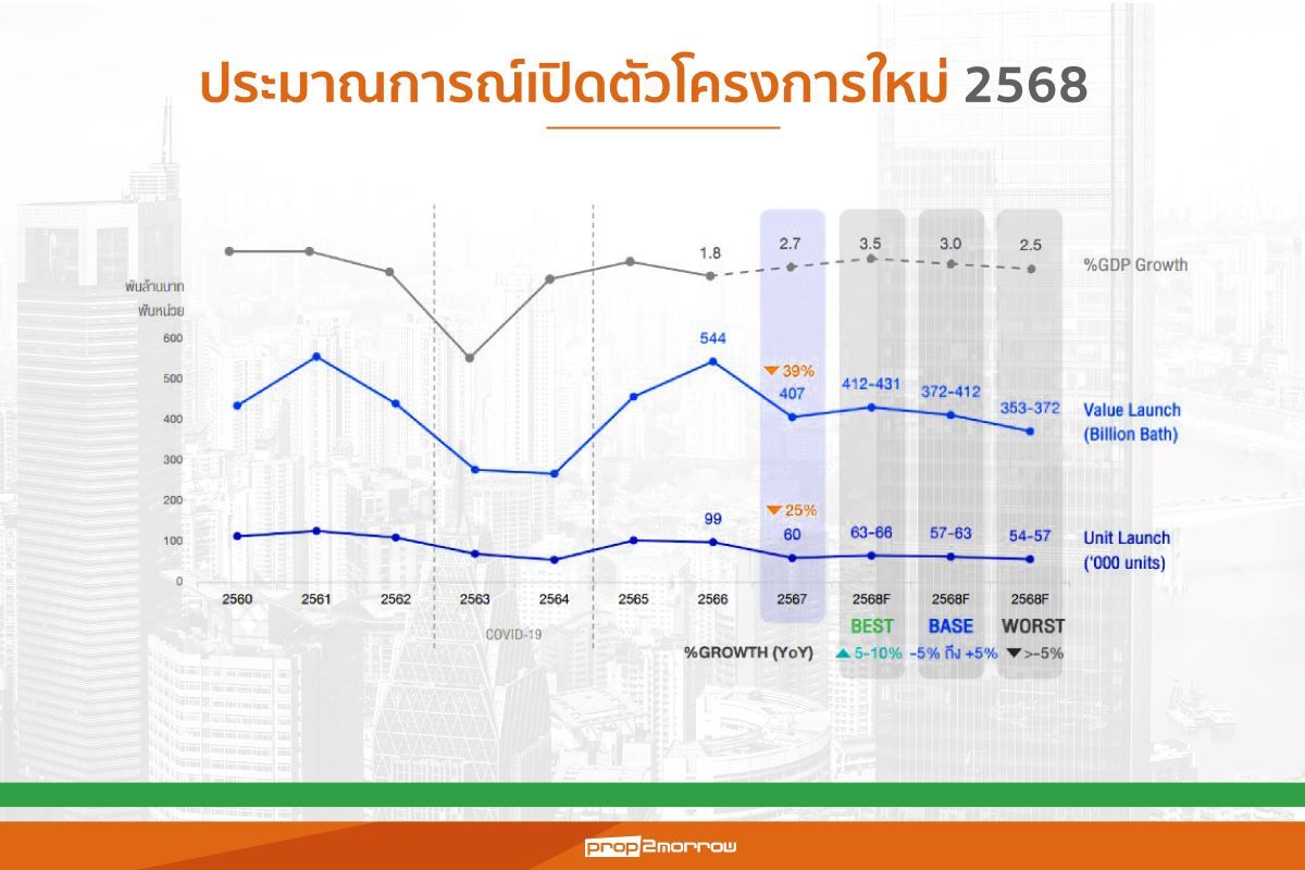 กรณีที่ดีที่สุด (Best Case) เป็นการคาดการณ์บนพื้นฐานจากสถานการณ์เศรษฐกิจไทยเติบโต 2.8-3% และ 3% ตามการคาดการณ์ของธนาคารแห่งประเทศไทยและสภาพัฒนาการเศรษฐกิจและสังคมแห่งชาติ ที่ประเมินว่าสถานการณ์การท่องเที่ยวจะเติบโตได้เท่ากับช่วงก่อนเกิดการแพร่ระบาดของ COVID-19 การลงทุนของภาครัฐเป็นไปตามแผนที่วางไว้ ภาคส่งออกยังคงเติบโตได้ การลงทุนของภาคเอกชนเติบโต และภาคการบริโภคภายในประเทศฟื้นตัวจากมาตรการปรับโครงสร้างหนี้ครัวเรือนของภาครัฐและราคาพลังงานทรงตัวในระดับที่ไม่เกิน 100 เหรียญสหรัฐฯ ต่อบาร์เรล ทำให้อัตราเงินเฟ้ออยู่ที่ระดับไม่เกิน 1.5% จะทำให้ปี2568 มีการเปิดตัวโครงการอสังหาริมทรัพย์ใหม่ในเขตกรุงเทพฯ-ปริมณฑล ประมาณ 62,000-65,000 ยูนิต คิดเป็นมูลค่าประมาณ 403,000 – 422,000 ล้านบาท หรือเติบโตประมาณ 3 – 7% เมื่อเทียบกับปี 2567 ที่มีจำนวนโครงการเปิดตัวใหม่ในพื้นที่กรุงเทพและปริมณฑลจำนวน 349 โครงการ รวม 60,386 ยูนิตมูลค่ารวม 407,204 ล้านบาท ลดลง 20.13% , 39.01% และ 25.18% ตามลำดับ เมื่อเทียบกับปี 2566