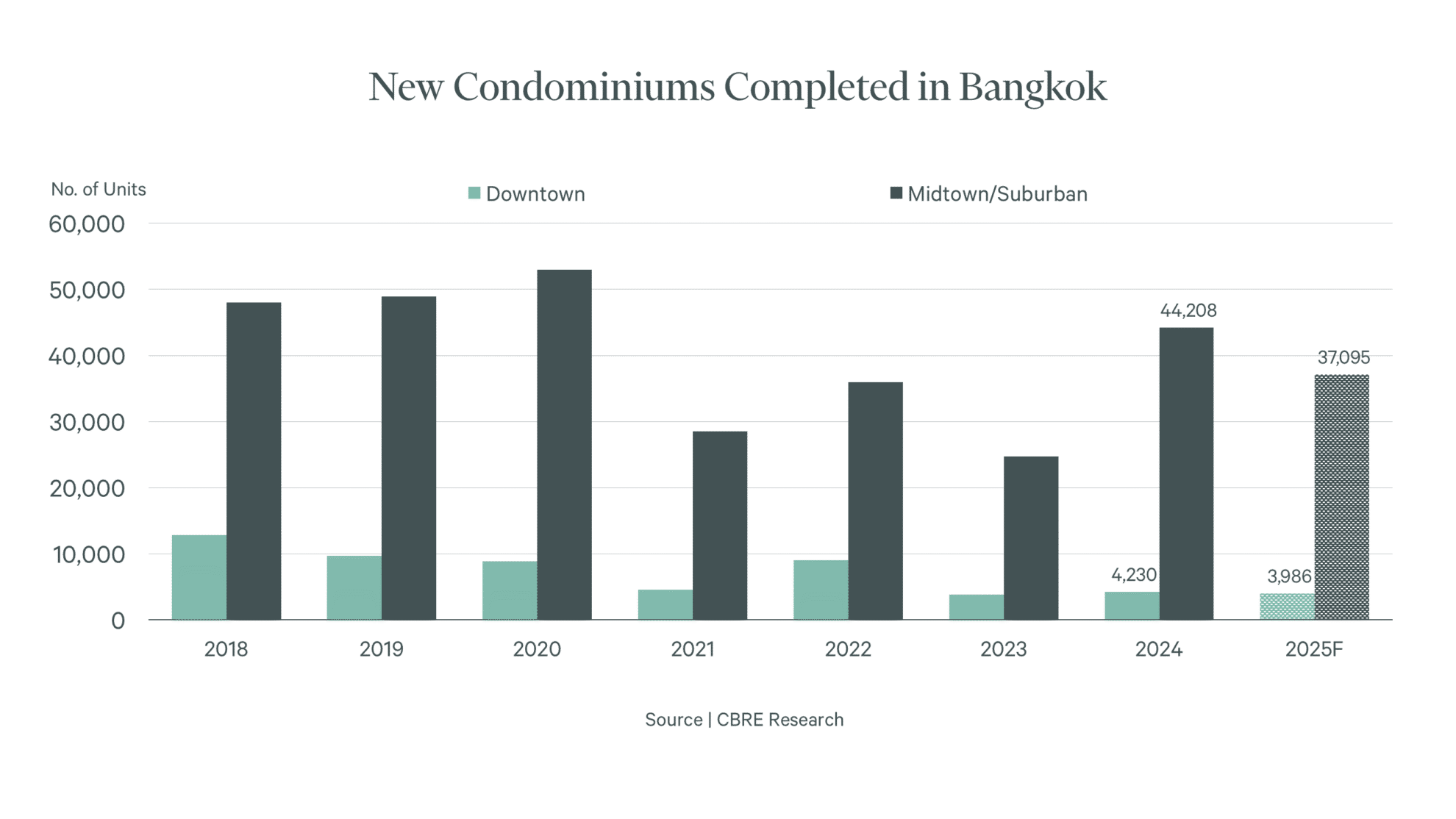 ขณะที่จำนวนห้องชุดมากกว่า 80,000 ยูนิตที่มีกำหนดก่อสร้างแล้วเสร็จในปี 2567–2568 โดยเฉพาะในพื้นที่มิดทาวน์และชานเมืองปี 2567 มีจำนวน 44,208 ยูนิต และในปีนี้จะมีจำนวน 37,095 ยูนิต คาดว่าจะต้องใช้ระยะเวลาประมาณ 5ปีในการระบายสต็อกสินค้าที่เหลือขายอยู่ในตลาดได้
