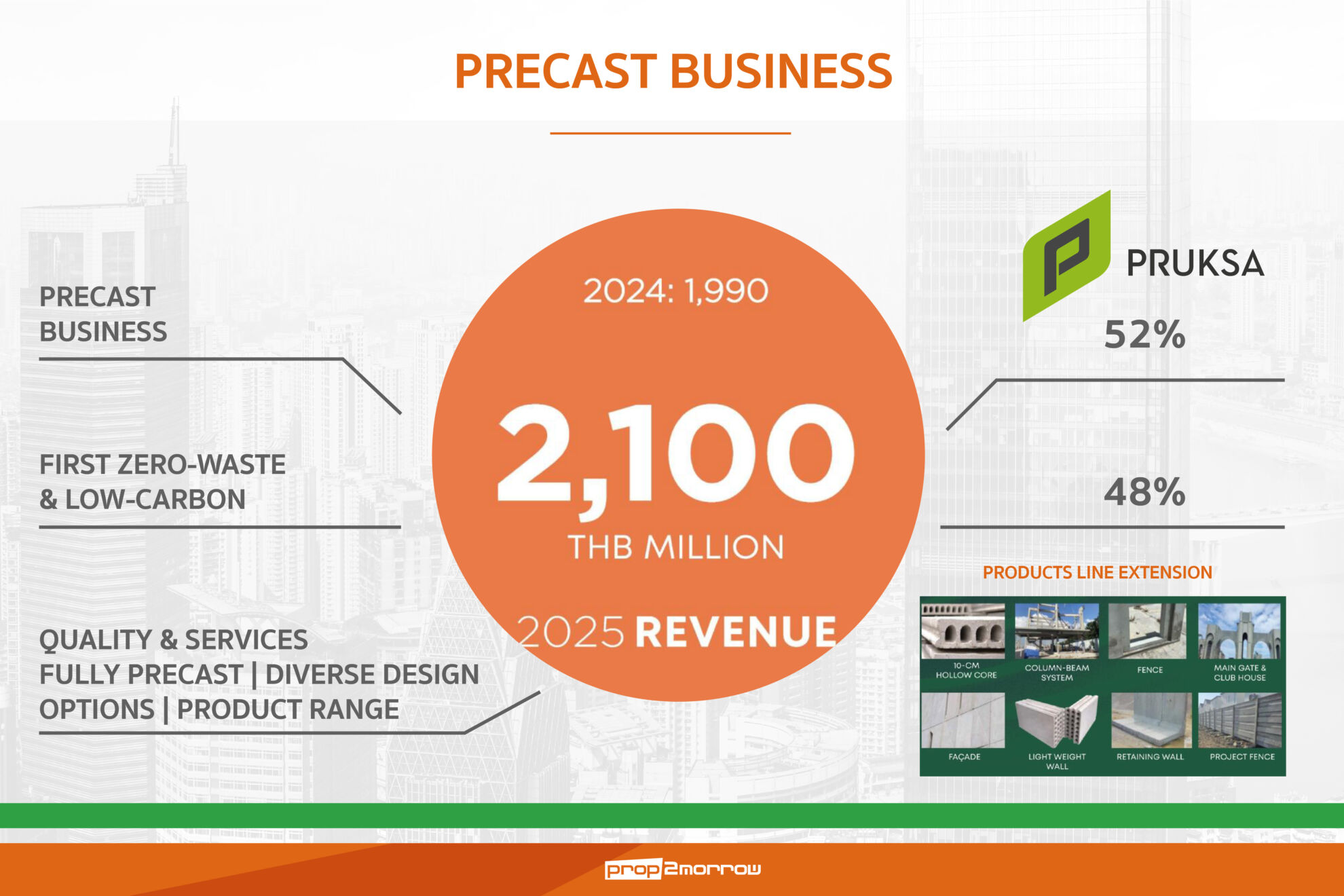 นอกจากนี้ยังได้ขยายการลงทุนในธุรกิจพรีคาสท์และก่อสร้าง โดยเตรียมขยายการผลิตและนำเสนอบริการที่ครอบคลุมมากขึ้น ด้วยโรงงานพรีคาสท์ซึ่งเป็นโรงงานสีเขียวที่ใหญ่ที่สุดในประเทศไทย มีกำลังการผลิต 5.2 ล้านตารางเมตรต่อปี และยังเป็นโรงงานปลอดขยะและลดคาร์บอนแห่งแรก โดยปีนี้ธุรกิจพรีคาสท์ตั้งเป้ารายได้ ไว้ที่ 2,100 ล้านบาท เน้นขยายกลุ่มผลิตภัณฑ์ให้หลากหลาย เพื่อตอบโจทย์ความต้องการของตลาดให้มากขึ้น เช่น ผนังน้ำหนักเบา และรั้วสำเร็จรูป (Project Fence) ในขณะที่ธุรกิจก่อสร้างตั้งเป้ารายได้ไว้ที่ 5,400 ล้านบาท มุ่งเจาะกลุ่มลูกค้าทั้ง B2B และ B2C สำหรับการสร้างบ้านลูกค้าทั่วไปในระดับราคา 10 – 30 ล้านบาท