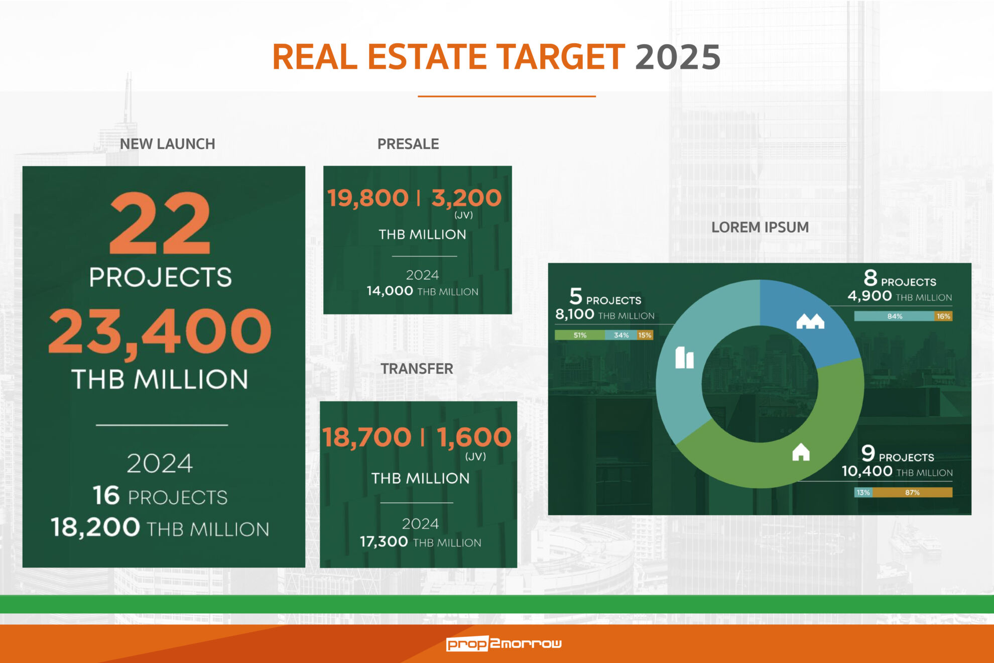 โดยตั้งเป้ายอดขายอสังหาฯเพื่อขาวปีนี้ไว้ที่ 19,800 ล้านบาท และยอดขายผ่านโครงการร่วมทุน (JV) อีก 3,200 ล้านบาท ส่วนเป้ายอดโอนตั้งไว้ที่ 18,700 ล้านบาท และยอดโอนผ่านโครงการ JV อีก 1,600 ล้านบาท ซึ่งในส่วนนี้จะรับรู้เป็นกำไรจากการลงทุนใน JV