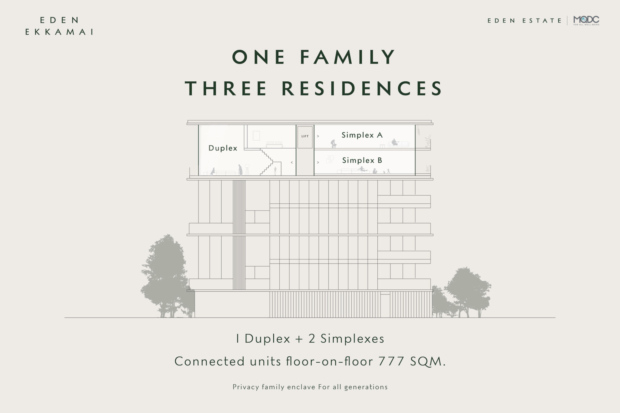 อีเดน เอสเตท (Eden Estate) หนึ่งเดียวที่รังสรรค์นิยามใหม่ของ “บ้านสำหรับทุกเจเนอเรชัน” ที่เปิดรับวิวพาโนรามาฝั่งทิศตะวันออกและทิศเหนือ โอบล้อมด้วยแสงธรรมชาติและบรรยากาศอันเงียบสงบของพระอาทิตย์ในยามเช้า บนพื้นที่ใช้สอยกว้างขวางถึง 777 ตร.ม. โดยมีพื้นที่ส่วนกลางที่เชื่อมต่อกันแบบ floor-on-floor เชื่อมแต่ละครอบครัวเข้าด้วยกันแบบ One Family เพื่อให้สมาชิกในครอบครัวได้ใช้เวลาร่วมกันอย่างมีคุณภาพ ในส่วนของ Three Residences ประกอบด้วยห้องชุดแบบ 1 Duplex residence และ 2 Simplex residences โดยแต่ละห้องชุดจะมีพื้นที่ส่วนตัวของแต่ละครอบครัว รองรับได้สูงสุดถึง 7 ห้องนอน รวมที่จอดรถ 9 คัน ซึ่งหาได้ยากใจกลางเมือง รวมถึง Private Lift