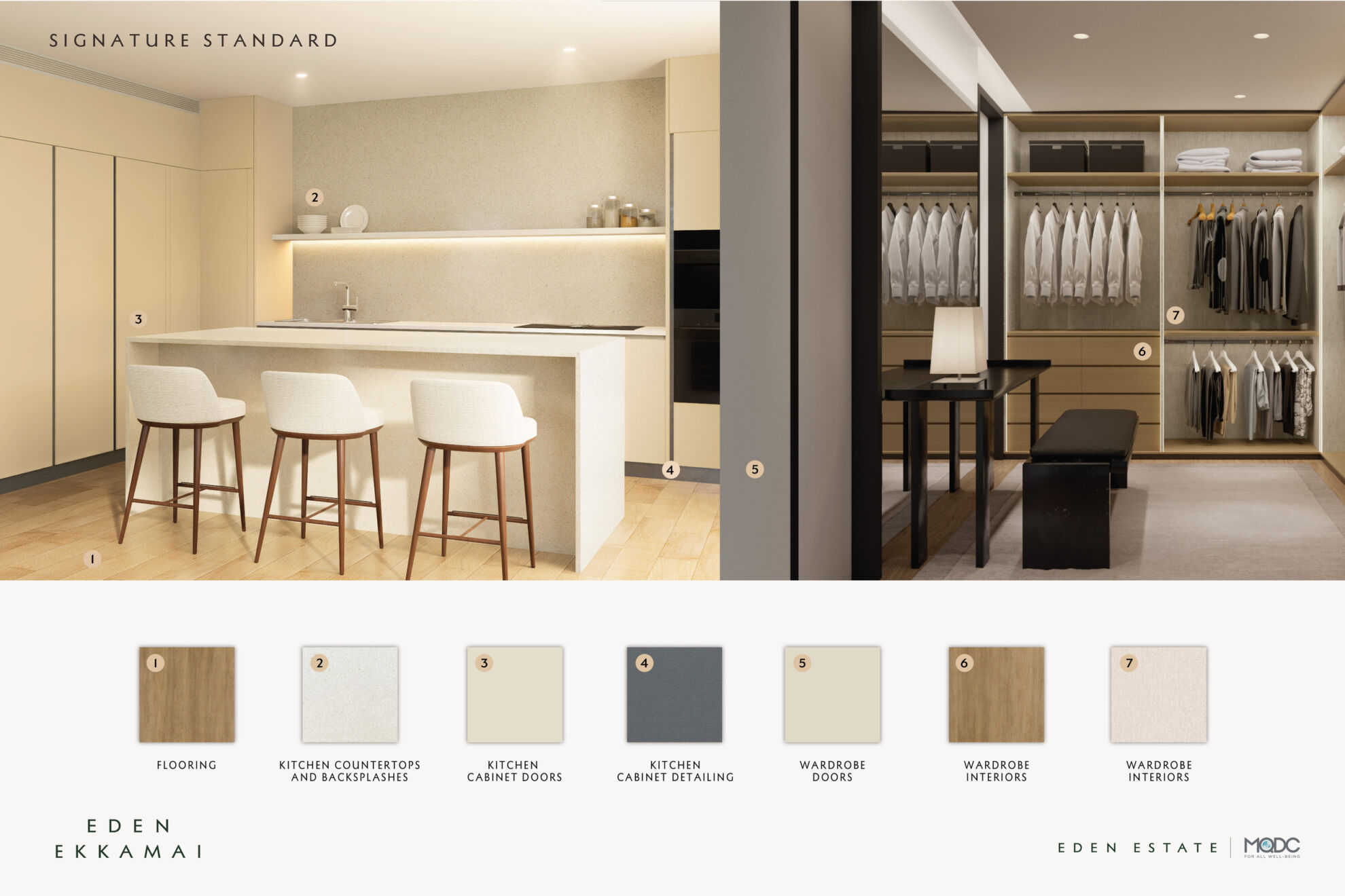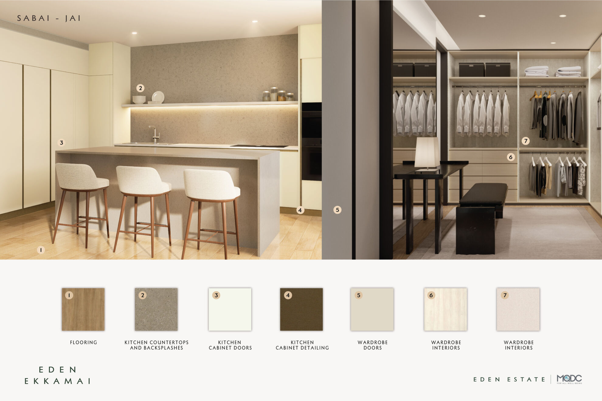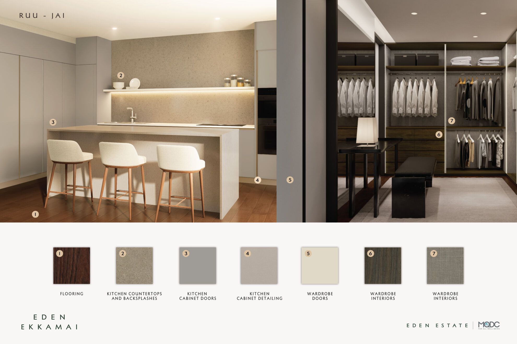 ทางโครงการยังได้มอบอิสระแก่ผู้อยู่อาศัยในการเลือกสรรวัสดุธรรมชาติระดับพรีเมียมที่ติดตั้งภายในห้องพักในส่วนของชุดครัวและตู้เสื้อผ้า ตอบโจทย์รสนิยม 3 สไตล์ ได้แก่ Signature Standard (มาตรฐาน) ความเรียบหรูเหนือกาลเวลามาพร้อมโทนสีอบอุ่น สะท้อนรสนิยมเรียบหรูและคลาสสิกเหนือระดับของผู้อยู่อาศัย Ruu-Jai (รู้ใจ) การใช้โทนสีเข้ม เพื่อถ่ายทอดเสน่ห์แห่งความหรูหราและสุขุม และ Sabai-Jai (สบายใจ) โทนสีอ่อน สัมผัสแห่งความเรียบง่าย สบายใจ ผ่านเส้นสายลายธรรมชาติของวัสดุ ซึ่งทุกองค์ประกอบผ่านคัดสรรออกแบบอย่างพิถีพิถัน ตั้งแต่โครงสร้าง สถาปัตยกรรม เลือกเฟ้นวัสดุธรรมชาติระดับพรีเมียม เพื่อให้ทุกตารางนิ้วสะท้อนตัวตนและรสนิยมอันเป็นเอกลักษณ์ของผู้อยู่อาศัยอย่างสมบูรณ์