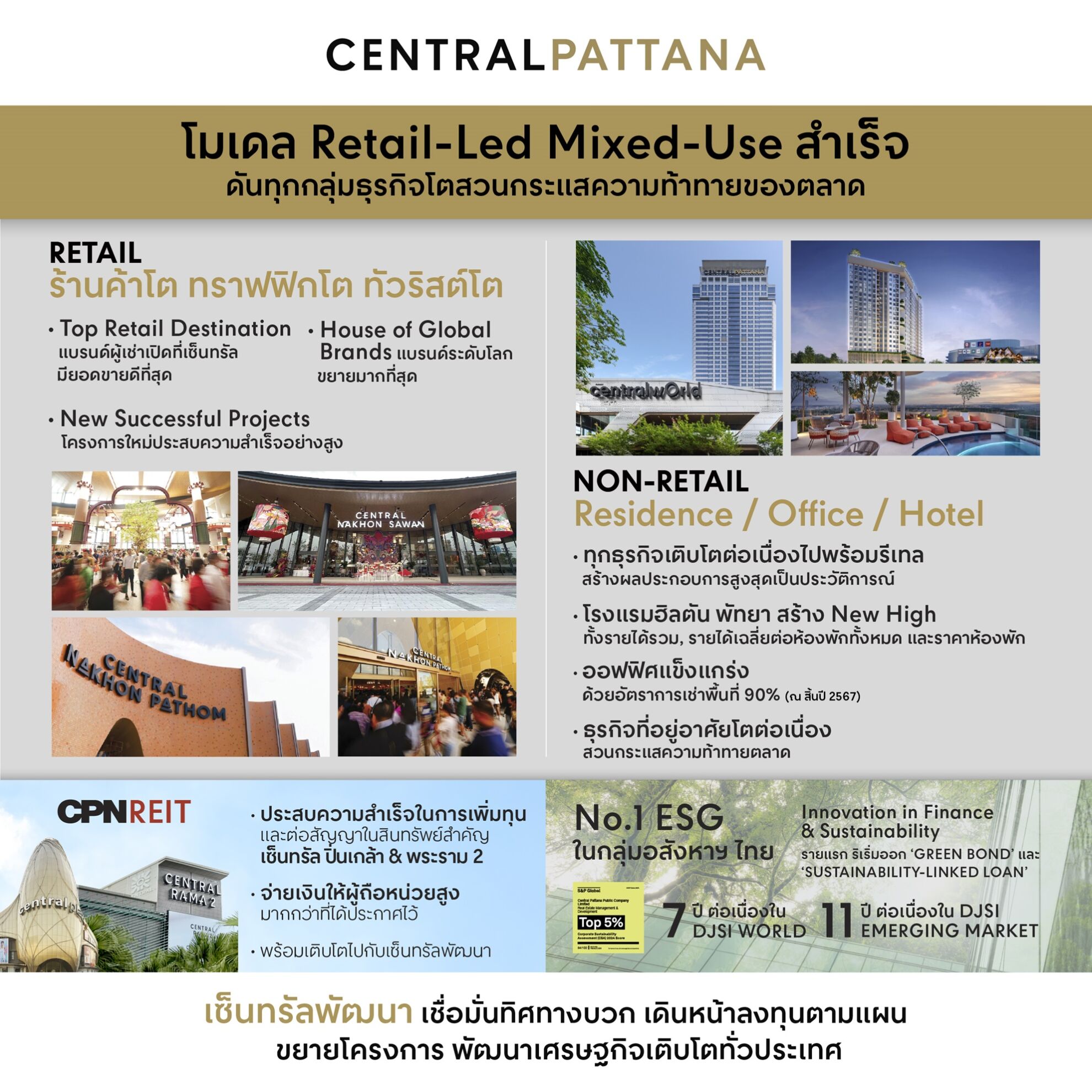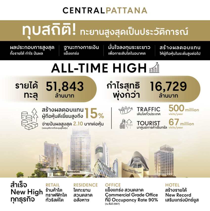 นภารัตน์ ศรีวรรณวิทย์ Chief Finance, Accounting and Risk Management Officer บมจ. เซ็นทรัลพัฒนา กล่าวเสริมว่า “ผลประกอบการใน ปี 2567 ของบริษัทฯ เติบโตดีเยี่ยมในทุกกลุ่มธุรกิจ ทั้งศูนย์การค้า โครงการที่อยู่อาศัย อาคารสำนักงาน และโรงแรมทั่วประเทศ โดยบริษัทฯ ได้รายงานงบการเงินปี 2567 ด้วยตัวเลขที่สูงสุดเป็นประวัติการณ์ มีรายได้รวมที่ 51,843 ล้านบาท และกำไรสุทธิ 16,729 ล้านบาท เติบโต 11% จากปีก่อนหน้า พร้อมสร้างผลตอบแทนผู้ถือหุ้นสูงถึง 15% รวมทั้งประกาศจ่ายปันผลสูงสุดเป็นประวัติการณ์ 2.1 บาทต่อหุ้น* โดยบริษัทฯ มีฐานะทางการเงินแข็งแกร่ง พร้อมเดินหน้าลงทุนสร้างการเติบโตและผลตอบแทนระดับสูงแก่ผู้ถือหุ้นต่อไป สะท้อนวิสัยทัศน์ระยะยาวของบริษัทในการดำเนินธุรกิจด้วยความยั่งยืน ลงทุนต่อเนื่อง มีความมั่นคงทางการเงิน ด้วยวินัยทางการเงินที่ดี และกลยุทธ์การดำเนินธุรกิจที่ดีที่ให้ผลตอบแทนแก่ทุก Stakeholders” (* ตัวเลขเพื่อนำเสนอและรอการอนุมัติจากผู้ถือหุ้น)