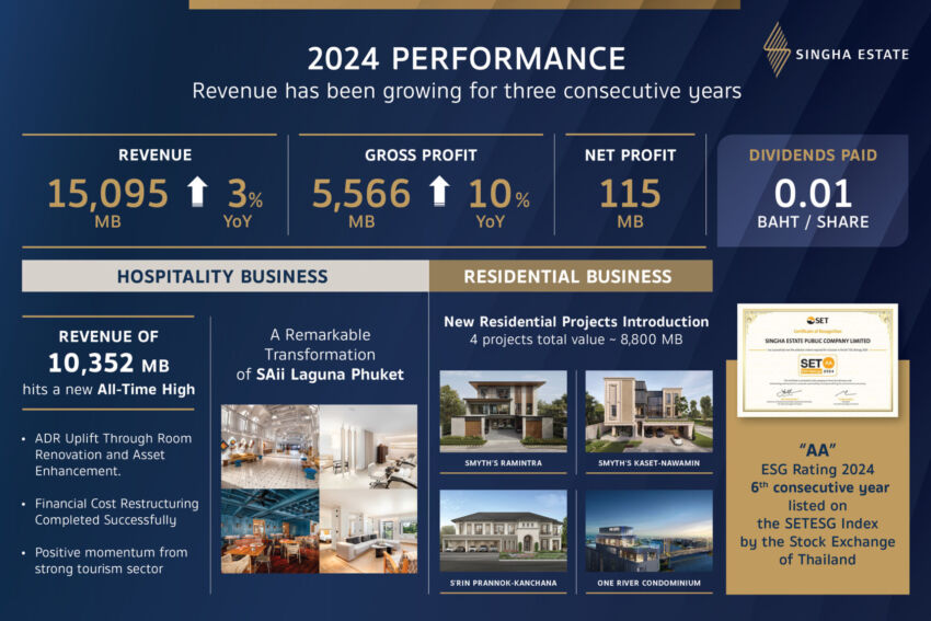 สิงห์ เอสเตท รายงานผลการดำเนินงานจากการขายและให้บริการของปี 2567 จำนวน15,095 ล้านบาท ปรับตัวเพิ่มขึ้น 3% จากปีก่อน โดยมีปัจจัยหลักจากผลประกอบการของธุรกิจโรงแรม หนุนด้วยธุรกิจนิคมอุตสาหกรรมและโครงสร้างพื้นฐาน สะท้อนการบริหารรายได้อย่างมีสมดุลระหว่างธุรกิจรายได้ประจำ (Recurring Income) และธุรกิจการขายอสังหาริมทรัพย์ (Non-Recurring Income)