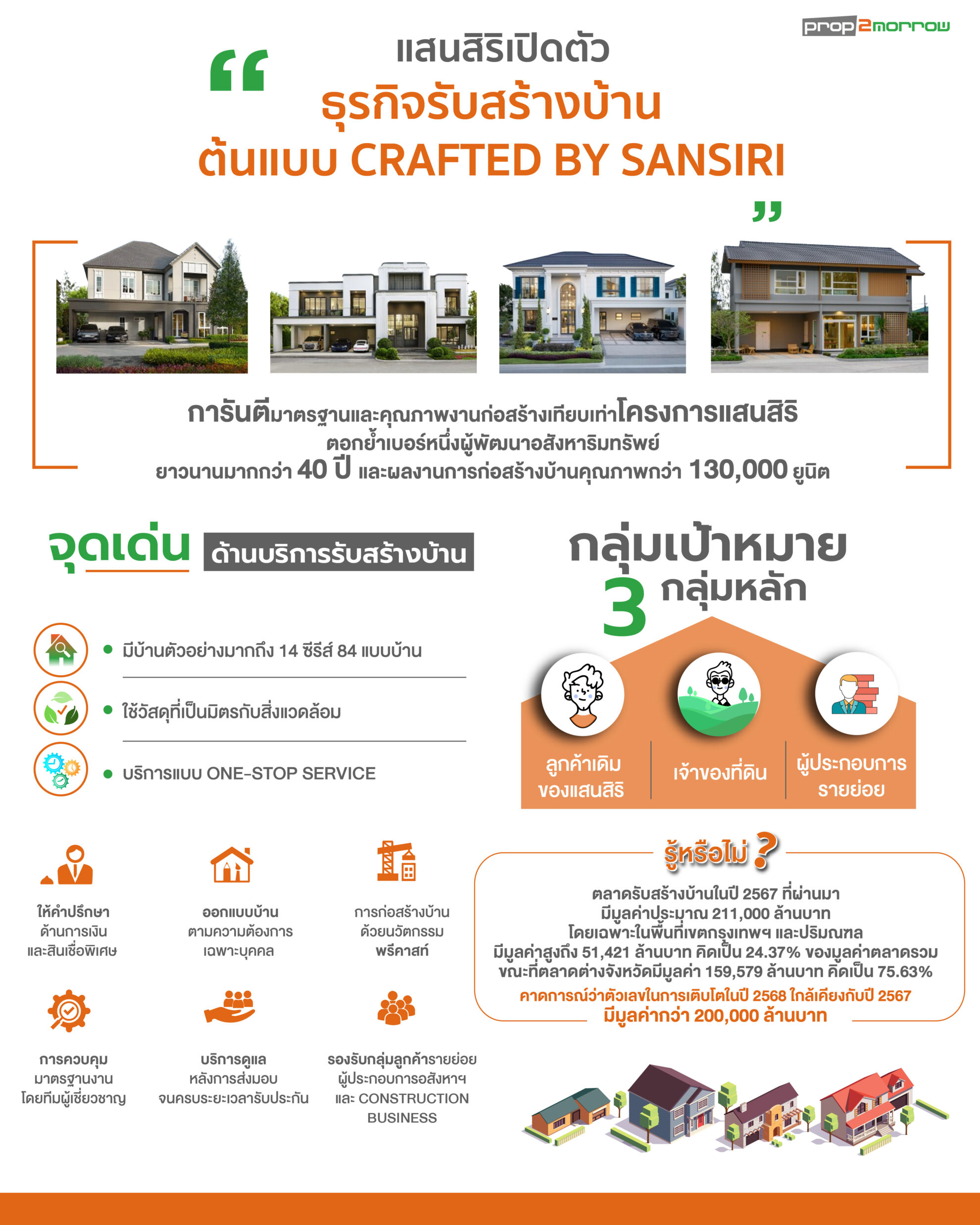 อาณัติ กิตติกุลเมธี รองกรรมการผู้จัดการอาวุโสสายงานพัฒนาโครงการแนวราบ บริษัท แสนสิริ จำกัด (มหาชน) เปิดเผยว่า บริษัทได้ขยายการลงทุนสู่ธุรกิจใหม่“ต้นแบบ Crafted by Sansiri” บริการรับสร้างบ้านที่มีจุดเด่นด้านการให้บริการรับสร้างบ้านที่มีบ้านตัวอย่างให้ลูกค้าได้เลือกมากถึง 14 ซีรีส์ 84 แบบบ้าน รวมถึงแบบบ้านที่ใช้วัสดุที่เป็นมิตรกับสิ่งแวดล้อม พร้อมบริการแบบ One-stop Service ของต้นแบบ Crafted by Sansiri ครอบคลุมทุกขั้นตอน ตั้งแต่การให้คำปรึกษาด้านการเงินและสินเชื่อพิเศษ การออกแบบบ้านที่ตอบโจทย์ความต้องการเฉพาะบุคคล การก่อสร้างบ้านด้วยนวัตกรรมพรีคาสท์ แข็งแรง ทนทานและมีคุณภาพสูง การควบคุมมาตรฐานงานโดยทีมผู้เชี่ยวชาญ และบริการดูแลหลังการส่งมอบจนครบระยะเวลารับประกัน รองรับกลุ่มลูกค้ารายย่อย ผู้ประกอบการอสังหาริมทรัพย์ รวมถึงกลุ่ม Construction Business